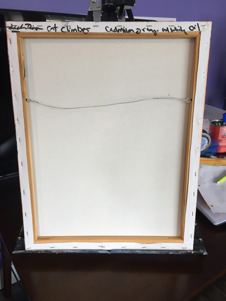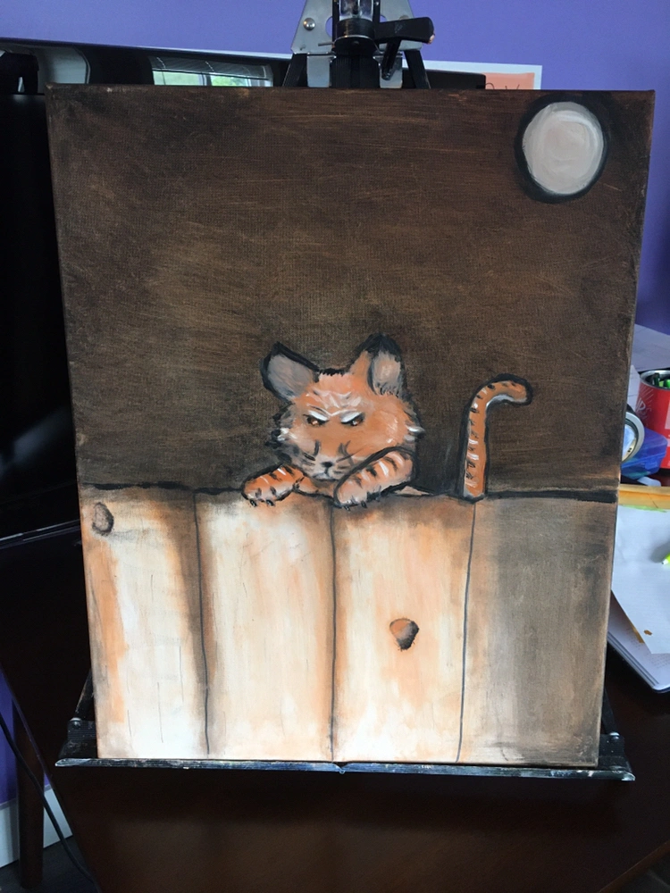 Original16x20 inch oil painting of a scary cat climbing a fence. Cat is so ugly that he is kinda cute.
