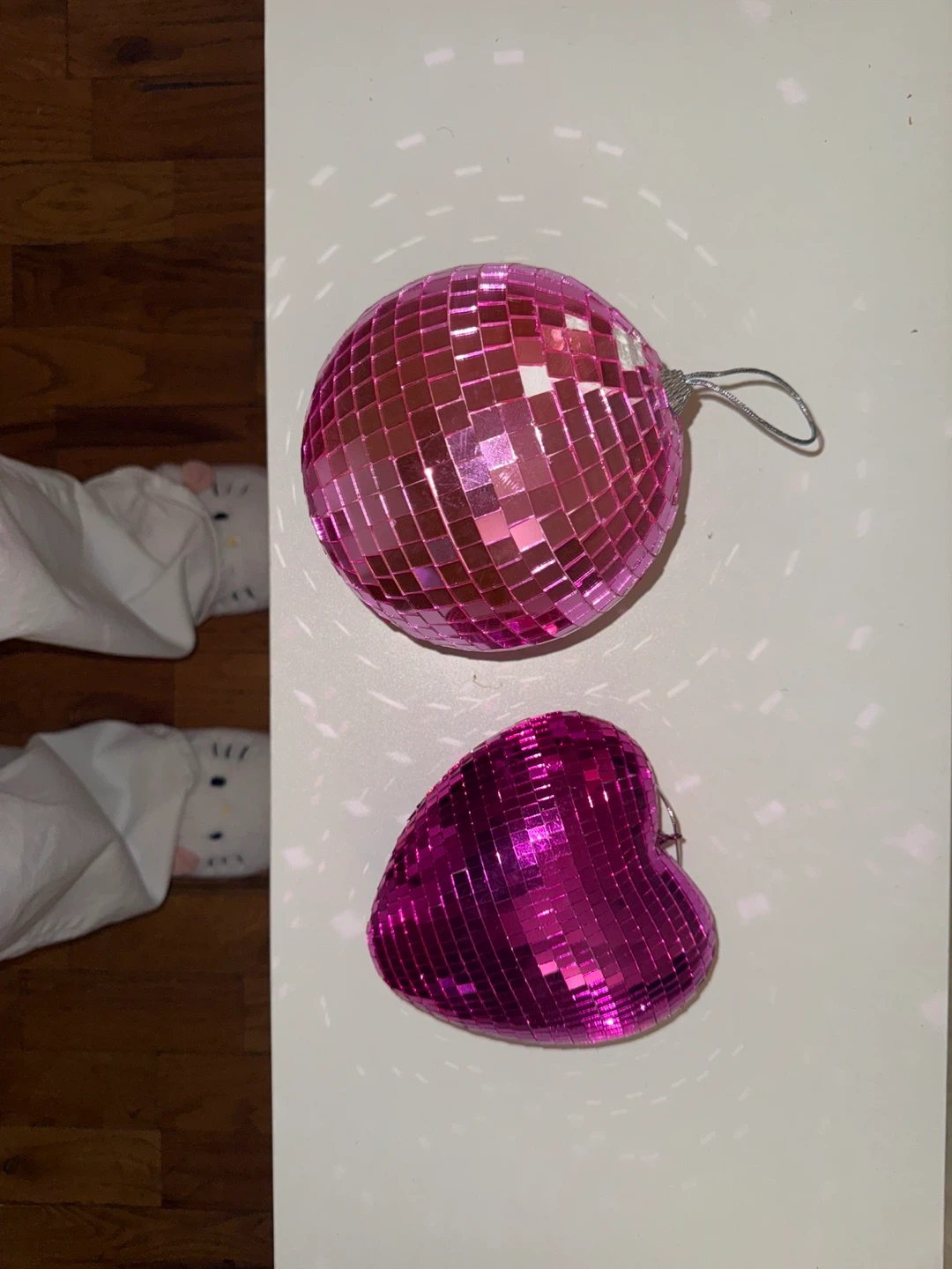 Two festive ornaments, one round disco ball and one heart shape. Both are covered in small pink mirrored tiles. They're perfect for holiday decorations or parties!