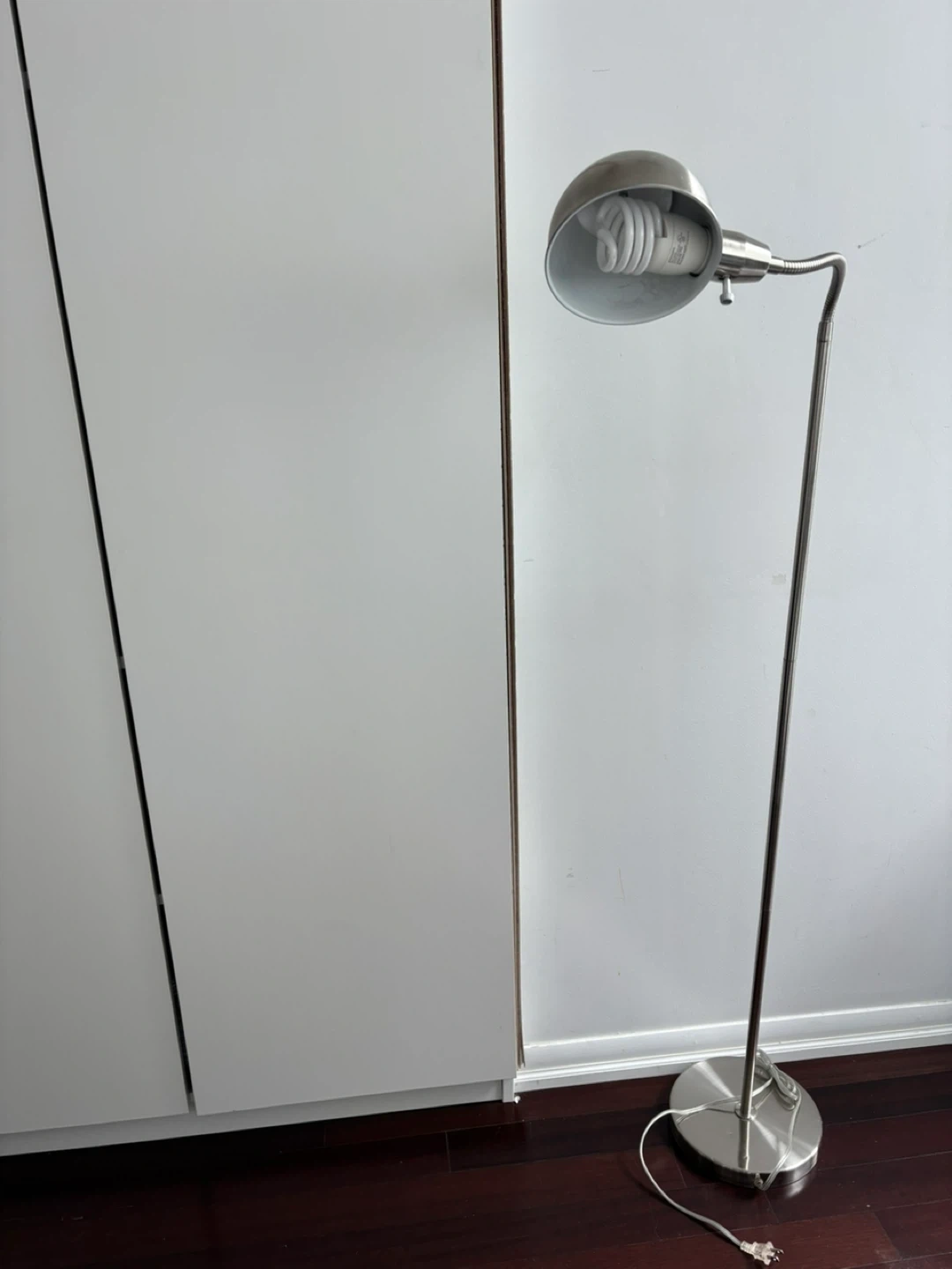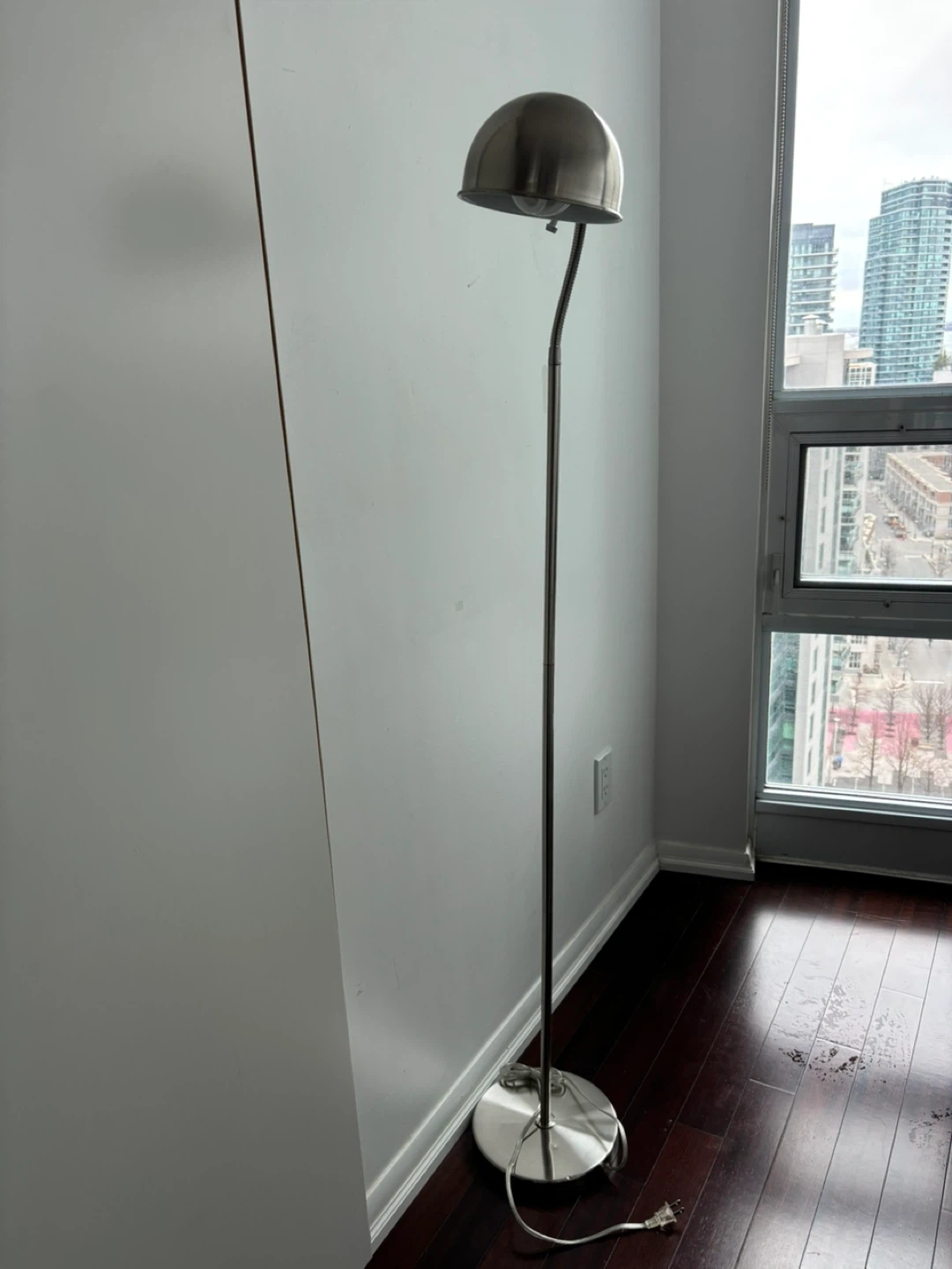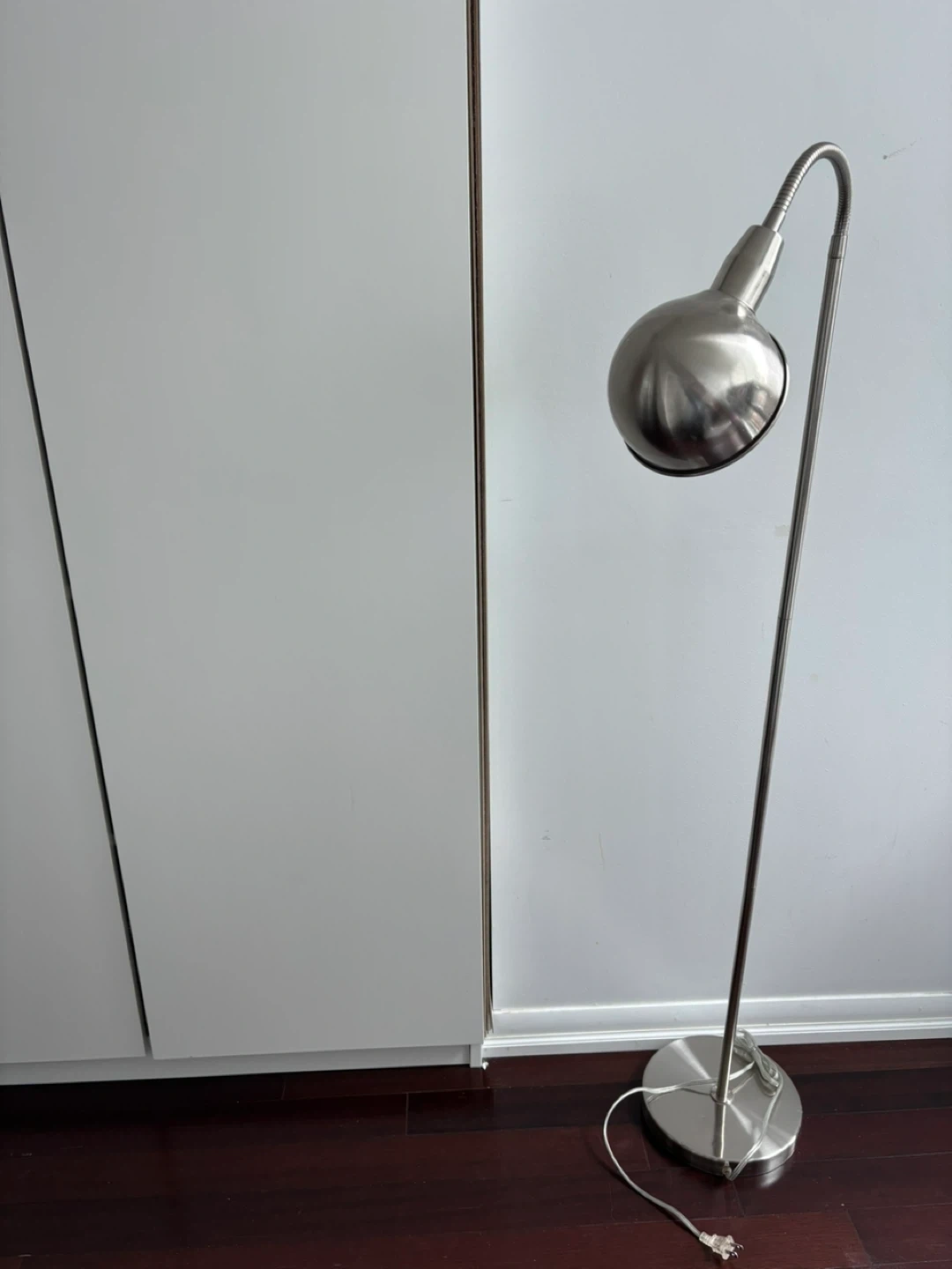A stylish silver arc floor lamp with a flexible gooseneck head for adjustable lighting. Includes one CFL bulb. Brushed metal finish.