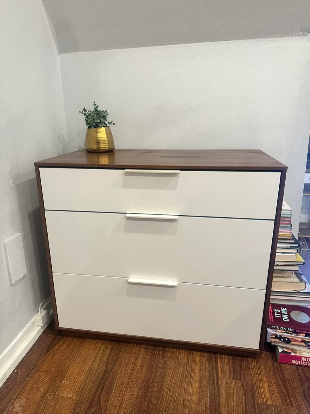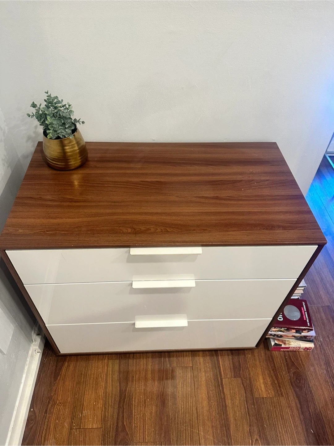 A three-drawer dresser with a wood-grain top and white drawer fronts. Just moved and don’t have use for it anymore. A few small scratches on the top as shown in photos. Pick up only (stairs in the unit)