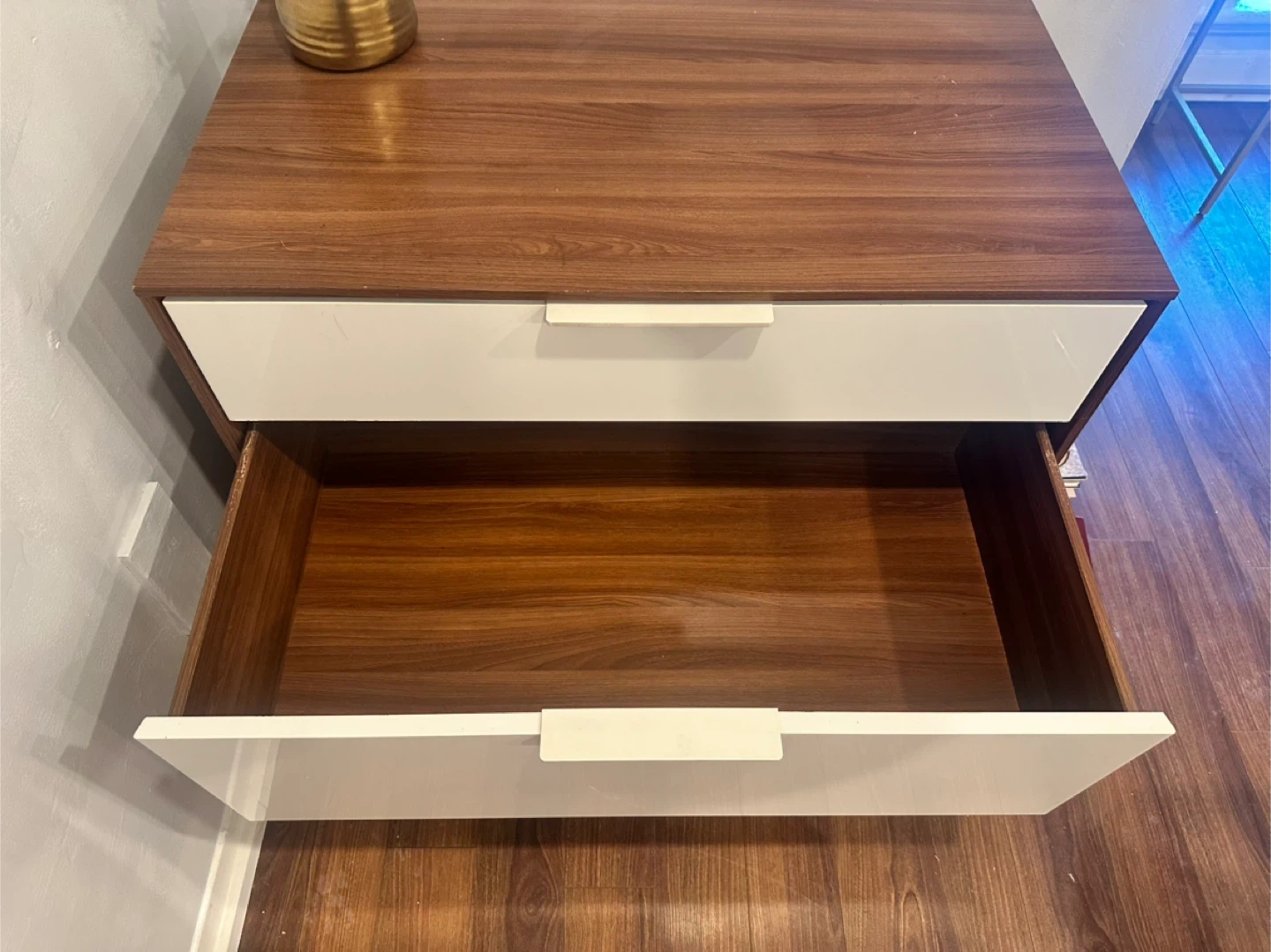 A three-drawer dresser with a wood-grain top and white drawer fronts. Just moved and don’t have use for it anymore. A few small scratches on the top as shown in photos. Pick up only (stairs in the unit)