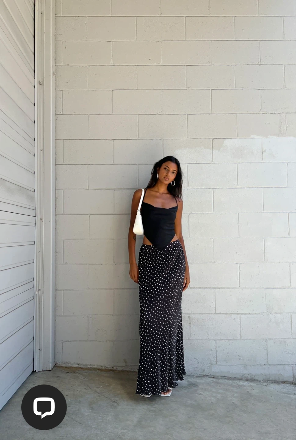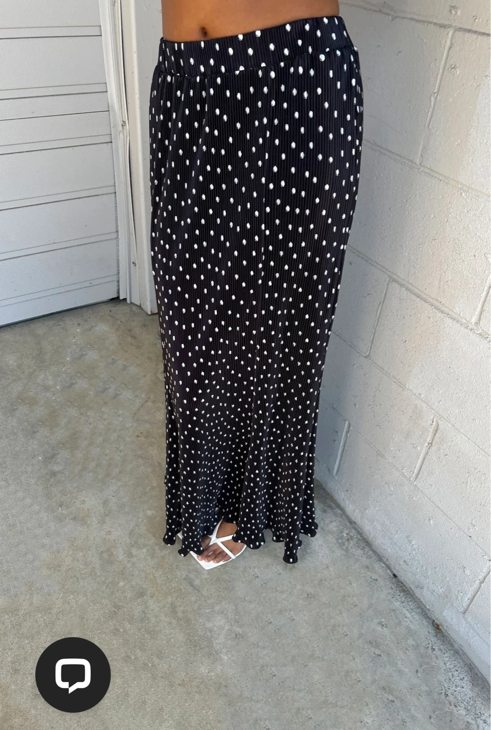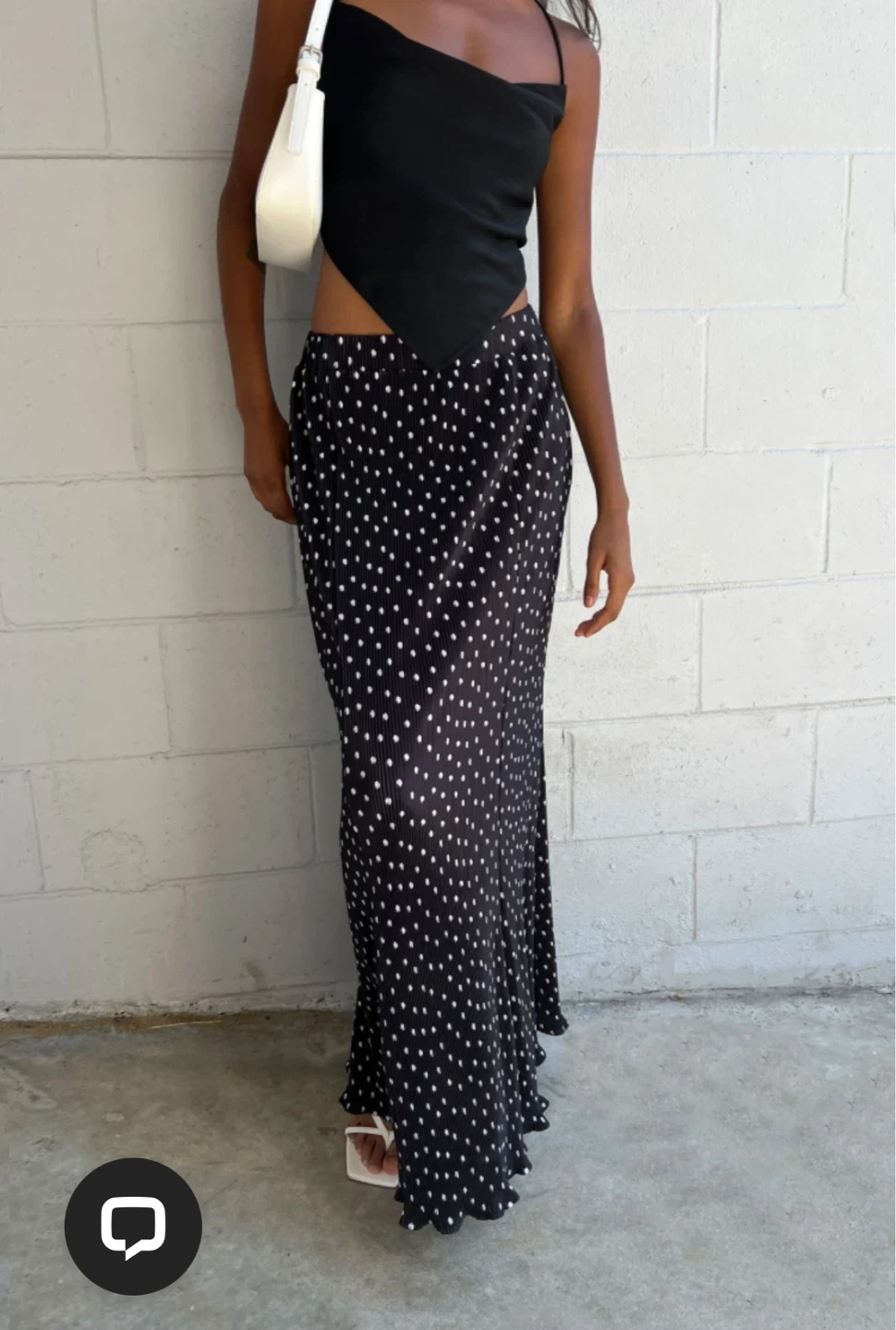 This maxi skirt has a polka dot print and is made from a pleated fabric. It has a relaxed fit with an elastic waistband. Wear yours with a cropped tank for a summery look.