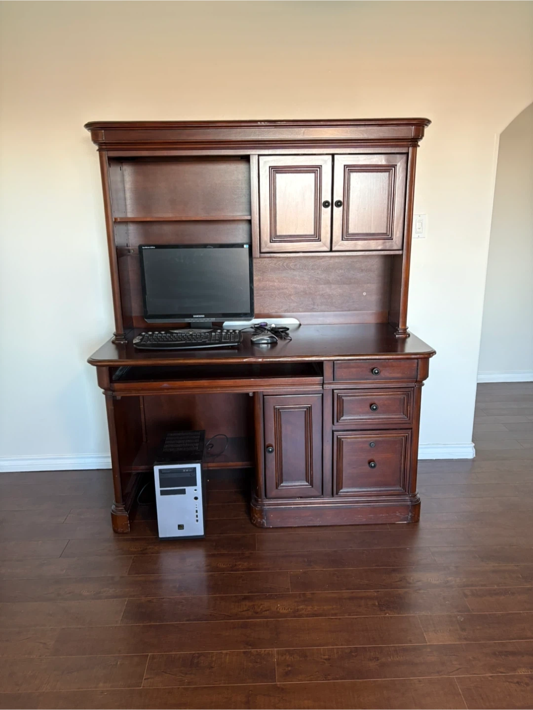 This is a classic wooden computer desk with a hutch. It features a pull-out keyboard tray and several drawers for storage. The hutch has shelving and cabinet space, perfect for organizing office supplies or displaying items.