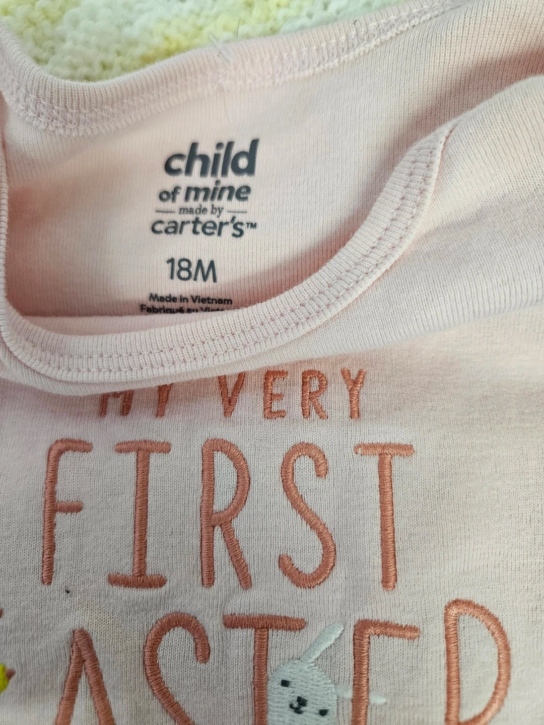 This sweet pink onsie from Child of Mine by Carter's is perfect for your little one's first Easter celebration. It features "My Very First Easter" embroidered on the front with cute bunny and chick graphics. Size is 18 months. It's made of soft, breathable fabric for comfort.