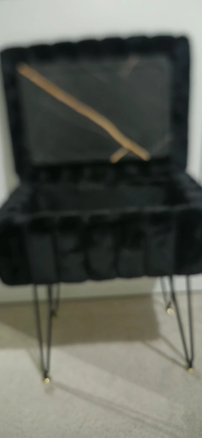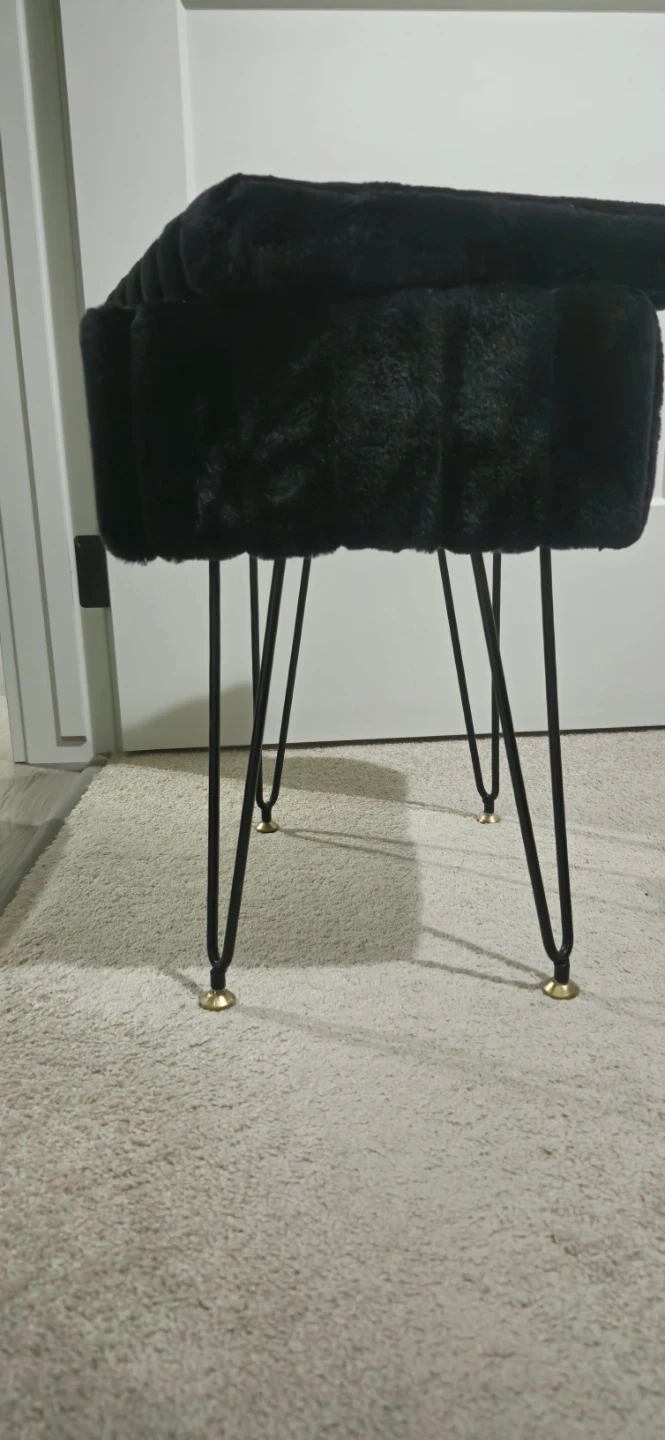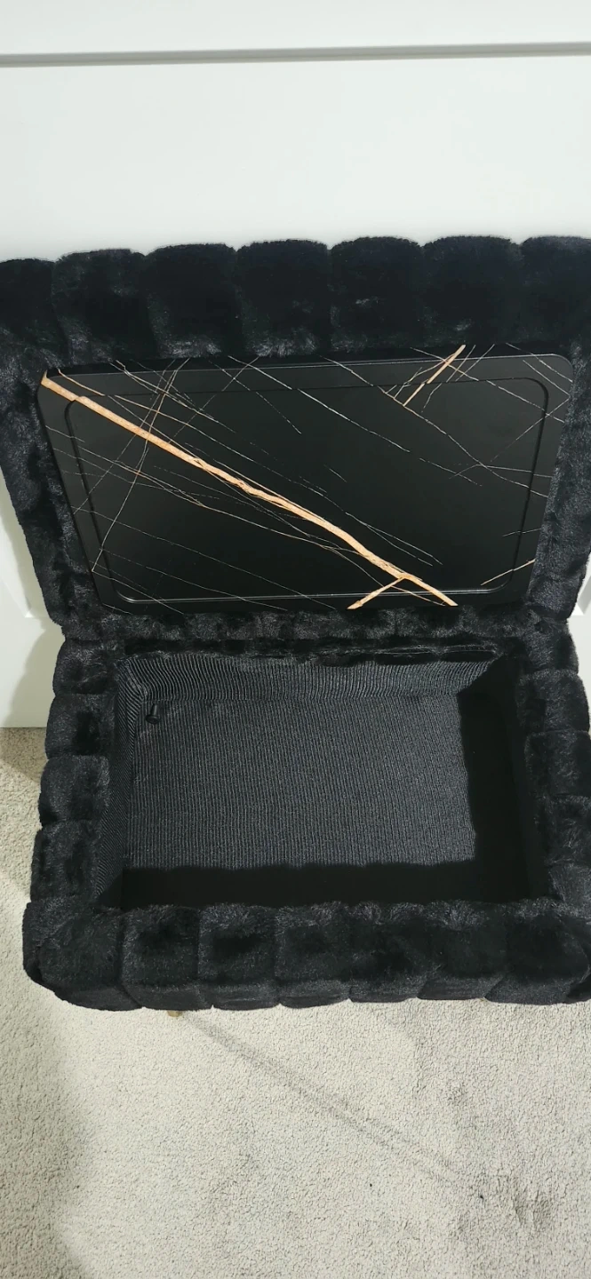 This is a stylish black faux fur storage ottoman. It has a black marble-look top and metal hairpin legs. It's perfect for adding a touch of glam to your space and providing extra storage