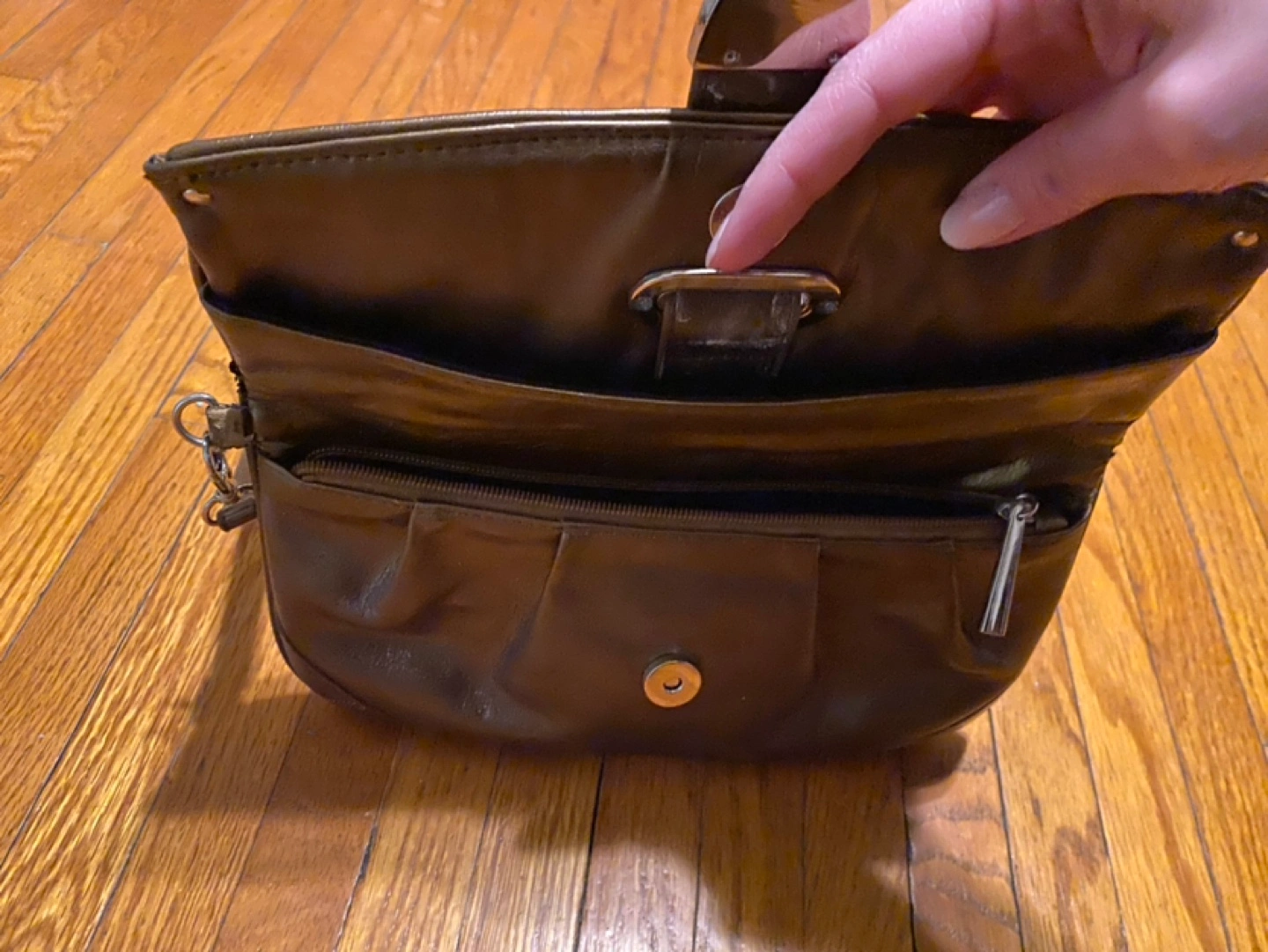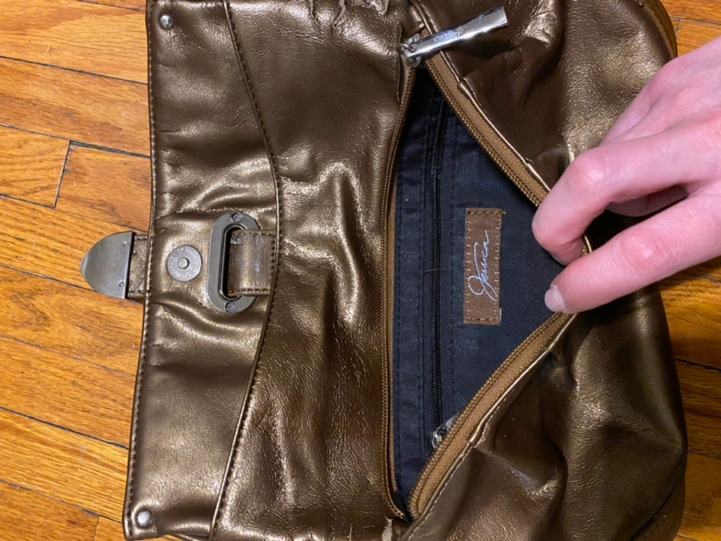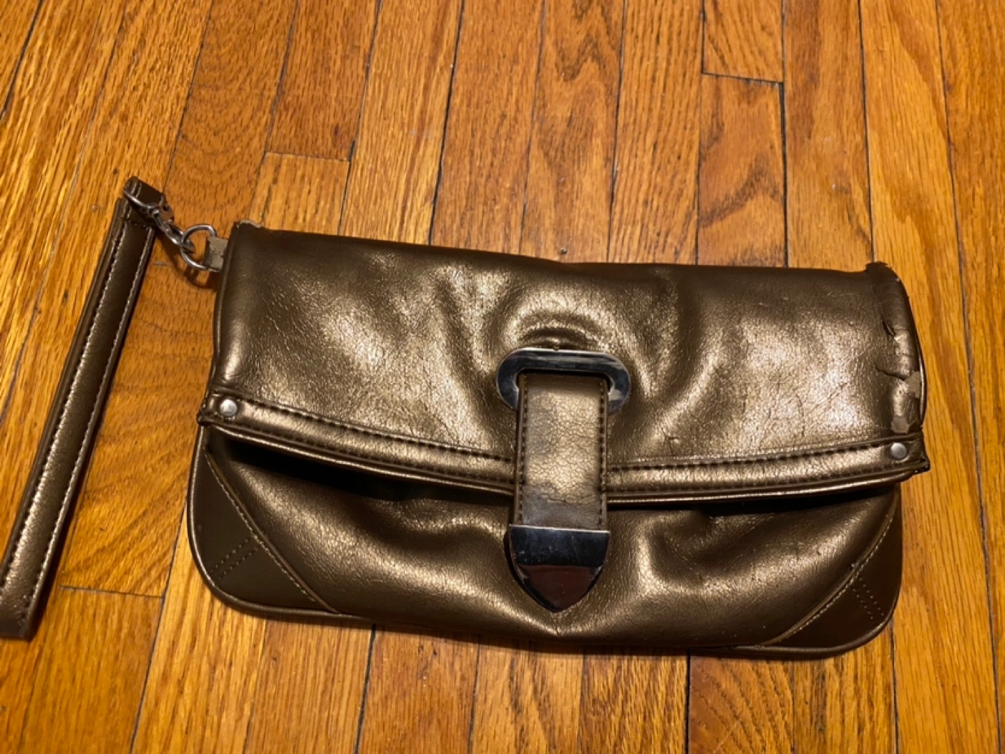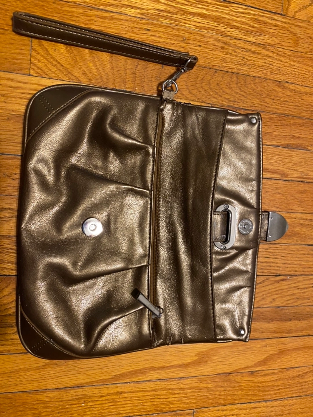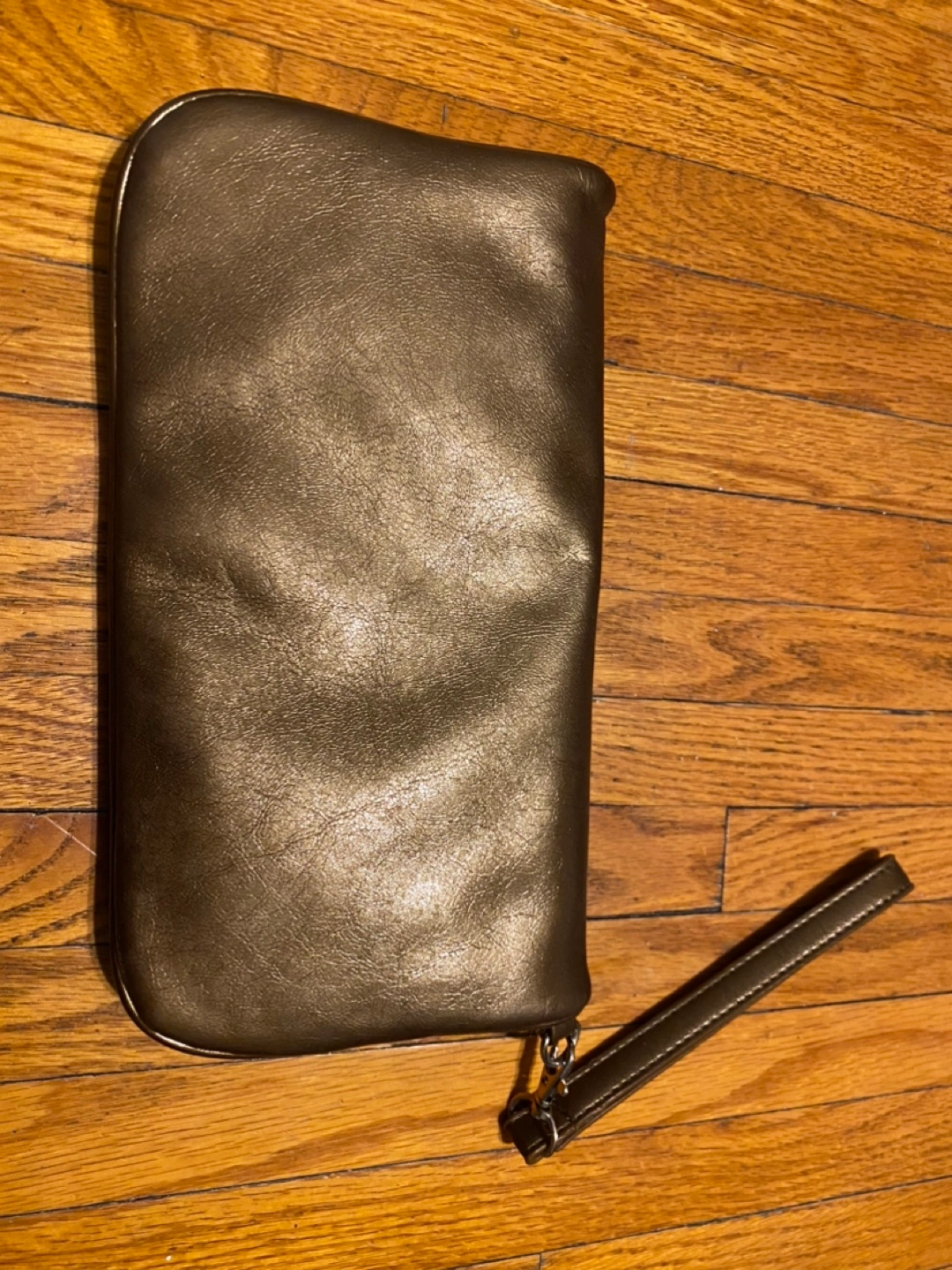 Metallic bronze clutch. Features a wristlet strap and buckle closure. Zippered main compartment and smaller interior pocket.