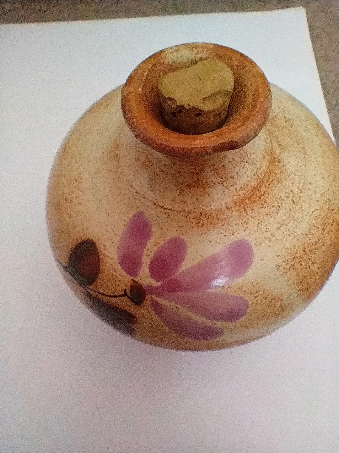 This has a unique spherical body. It features a hand-painted pink flower design with brown accents. A cork stopper is included for the spout.