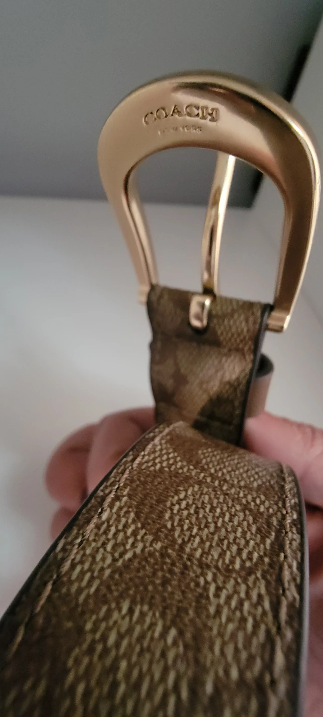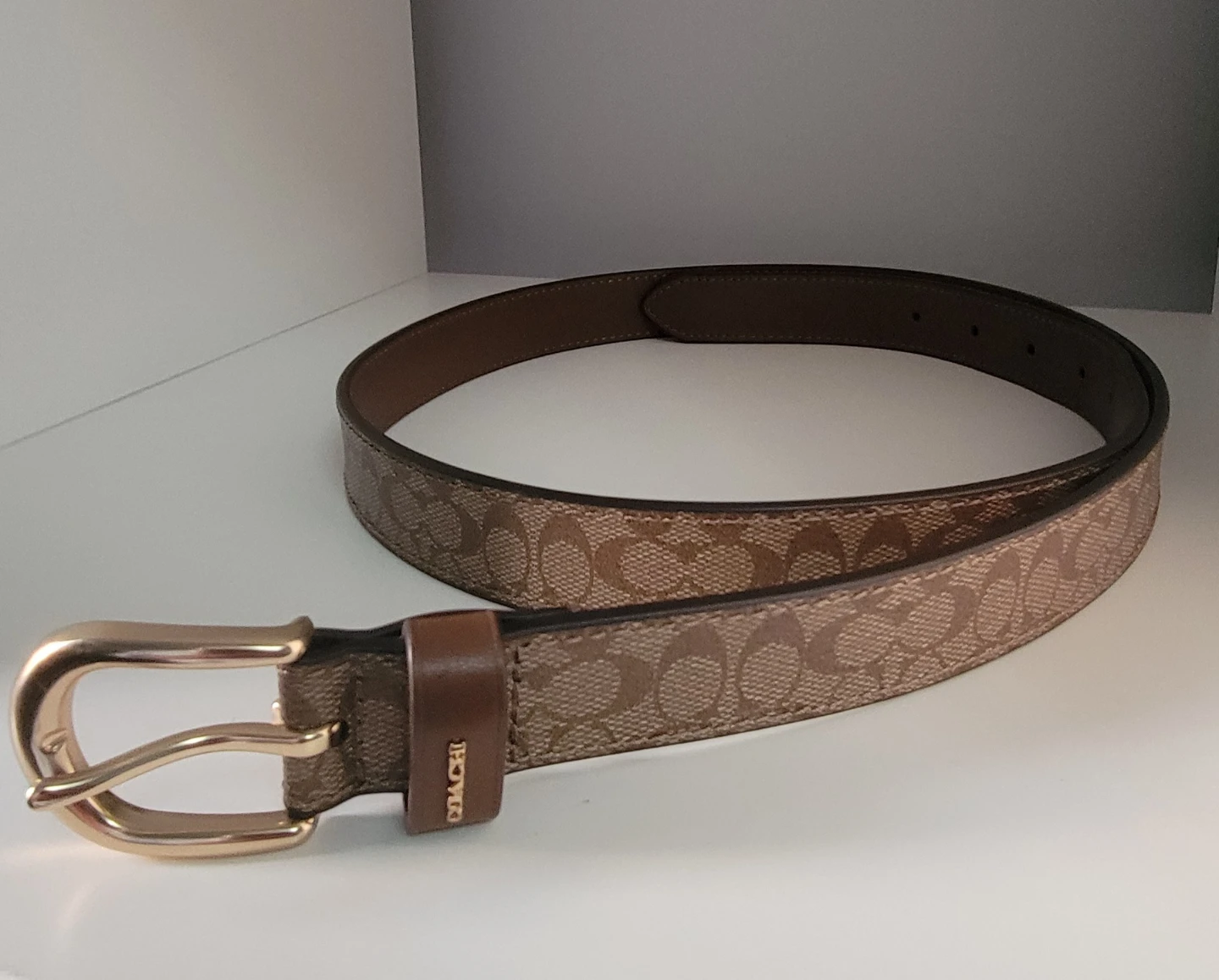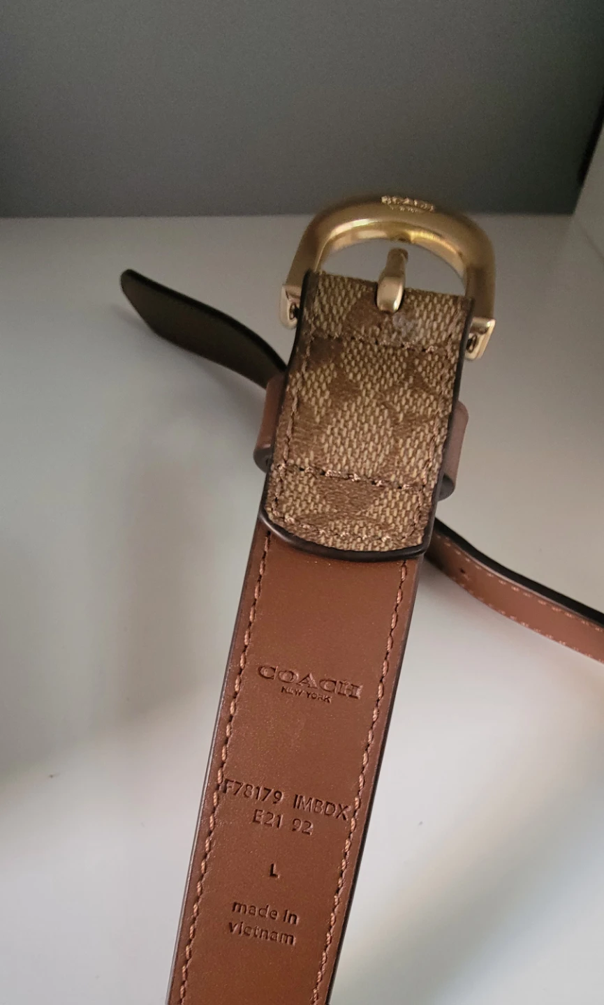 Selling a Coach belt in size L. It features the signature Coach pattern and a gold-tone buckle. The style number is F78179 IMBOX. Made in Vietnam.