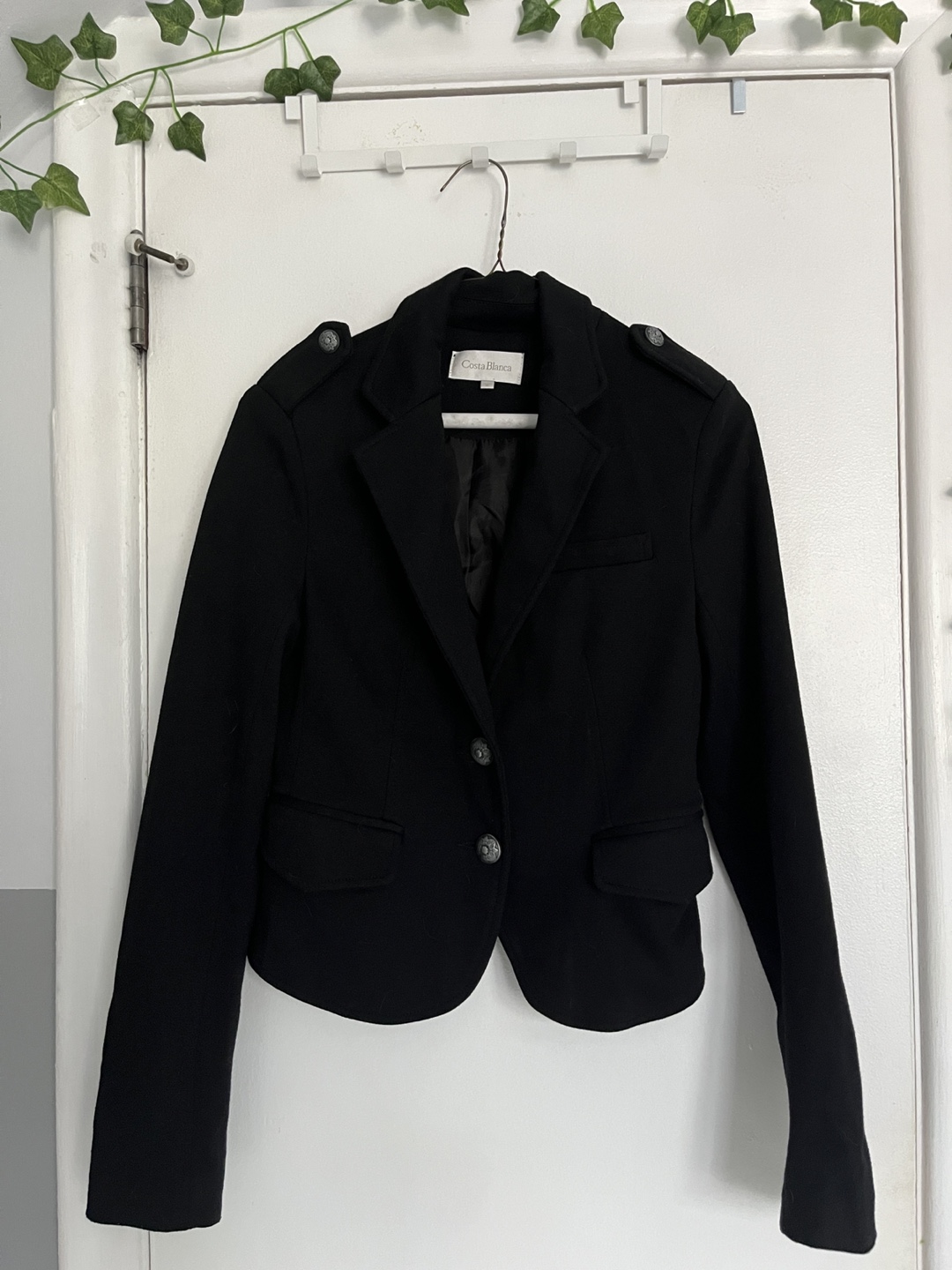 Selling a stylish black blazer from Costa Blanca! It's in great condition and perfect for dressing up or down. The size is 2, and it features a classic design with button details on the shoulders and front. A great addition to any wardrobe!