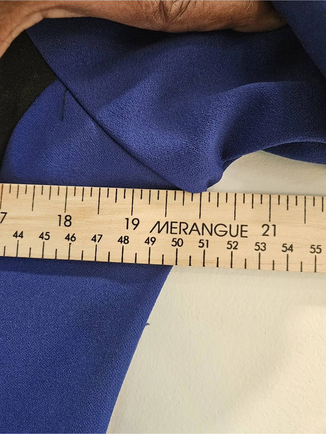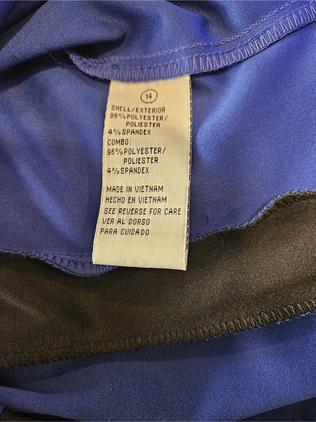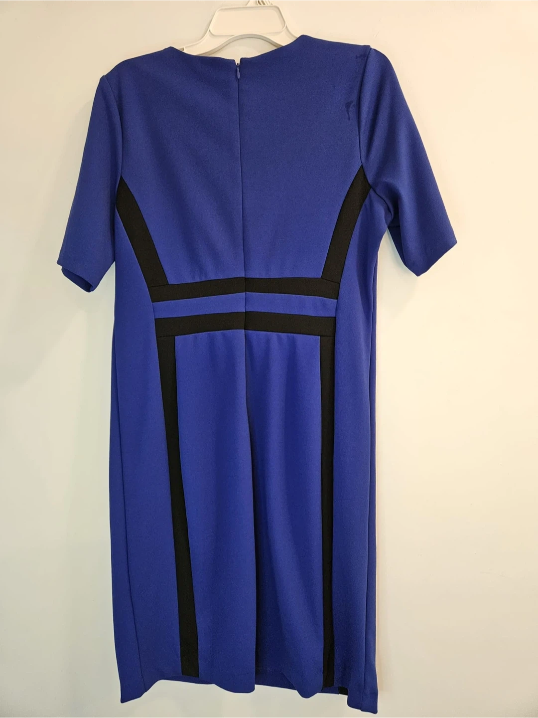This Shelby & Palmer dress is a vibrant blue with black panel accents. It features a classic sheath silhouette with short sleeves. Measurements available upon request.