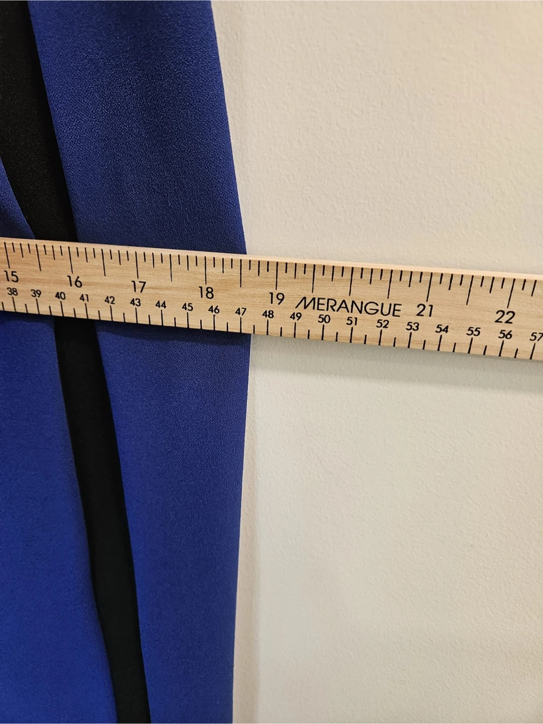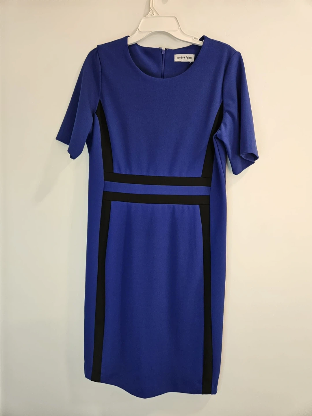 This Shelby & Palmer dress is a vibrant blue with black panel accents. It features a classic sheath silhouette with short sleeves. Measurements available upon request.