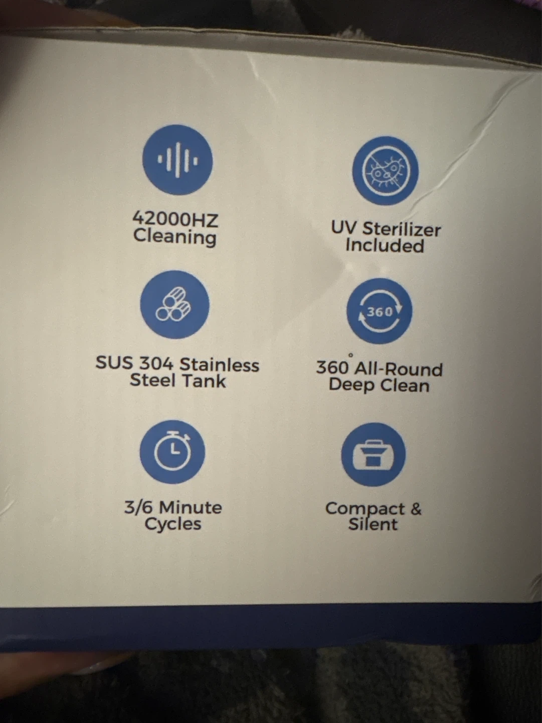 This ultrasonic cleaner uses 42000HZ cleaning power and includes UV sterilizing lights. It features a SUS 304 stainless steel tank and 3/6 minute cycles. The unit is compact and quiet.