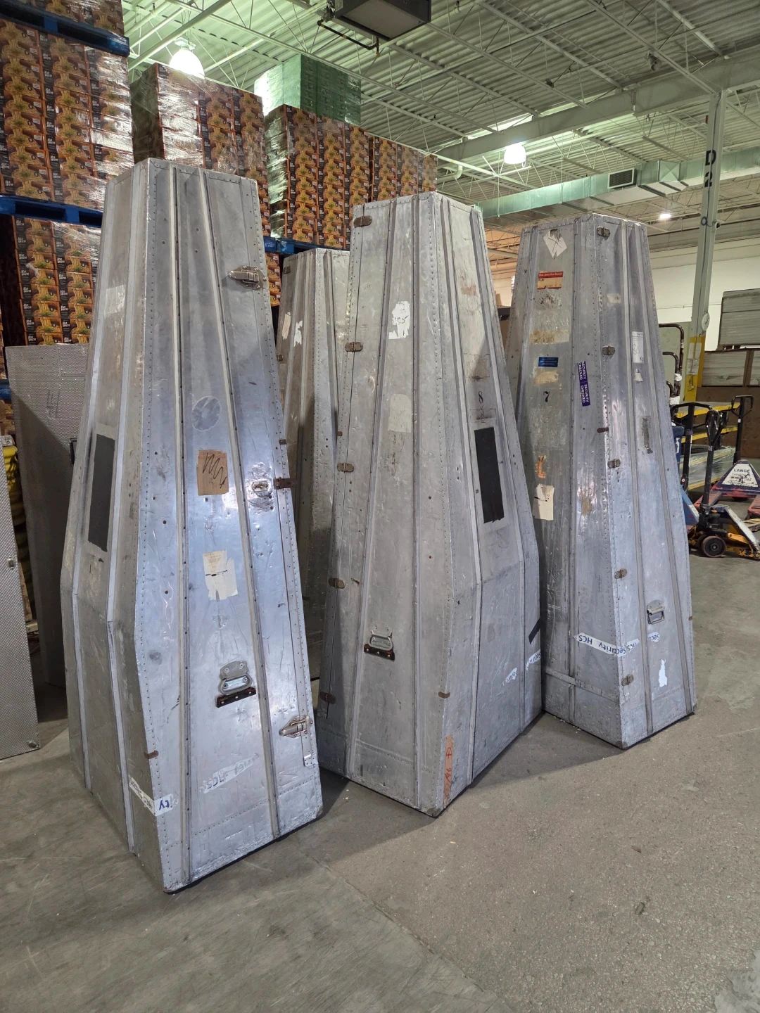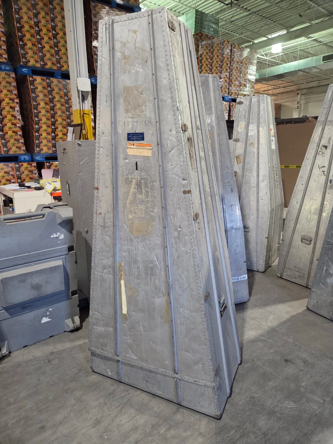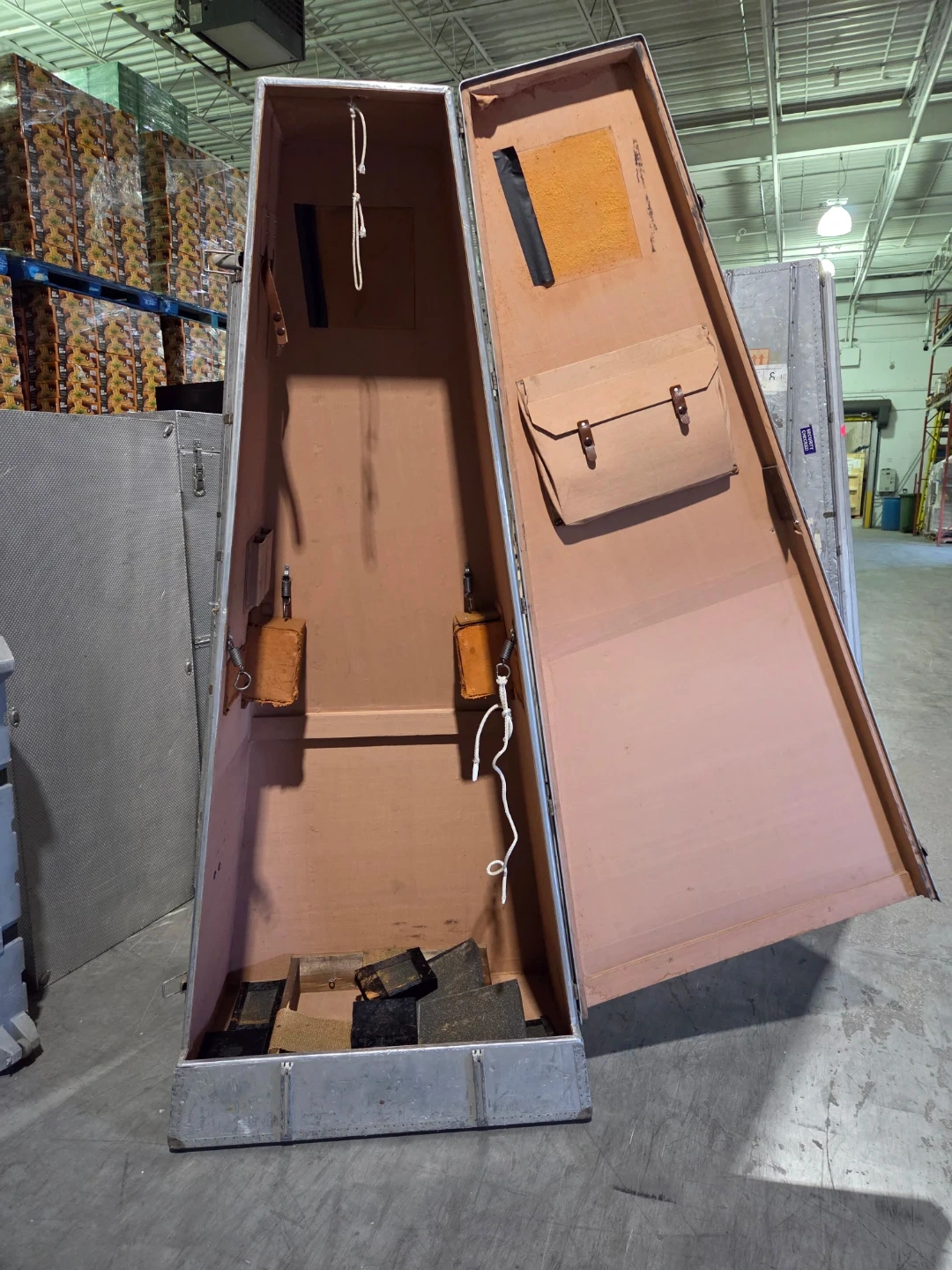 Odd square cone shape shipping crates. Asking $250 each, first come first choice. Upright bass case with a suspended area so the bass does not hit the bottom of the case. Very old, possibly from the 70s, maybe earlier, but still have life left in them for creative uses. You could use them to store large items upright or lay it down as more of a flat trunk. Up to you. Could be used as a halloween prop or heavy metal bands stage decor. 5 available.