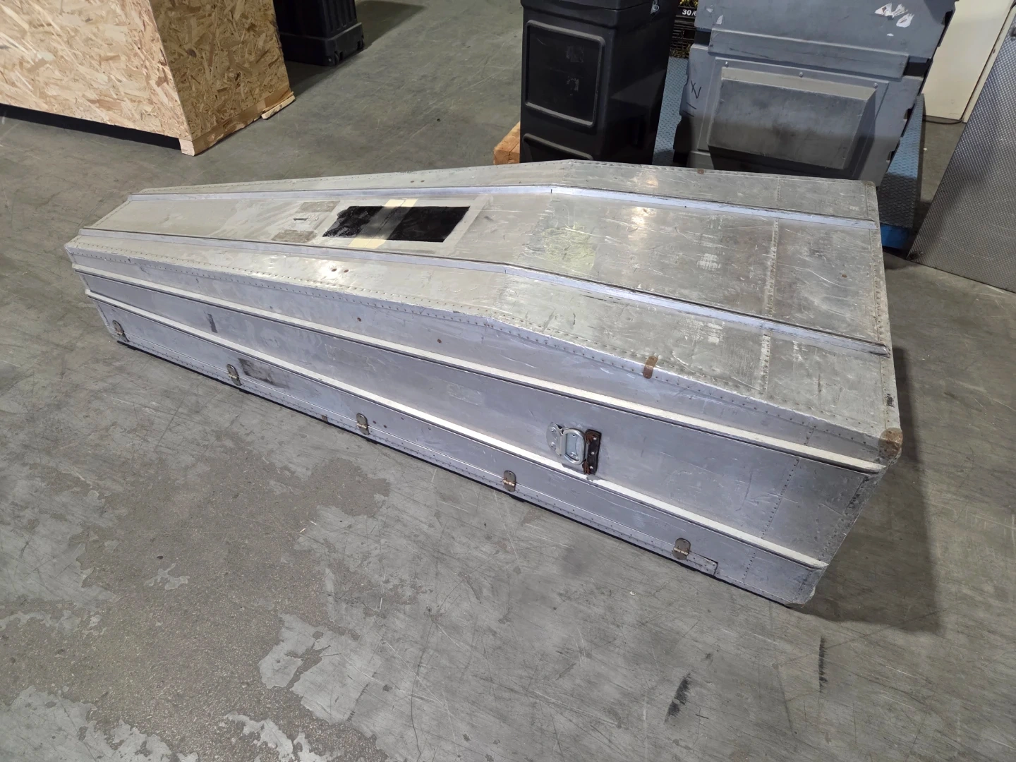 This is a vintage protective case made of aluminum. It's a large, hard-shelled container designed for transport and storage. The interior has straps and pockets for securing items. It's a sturdy, industrial-style case.