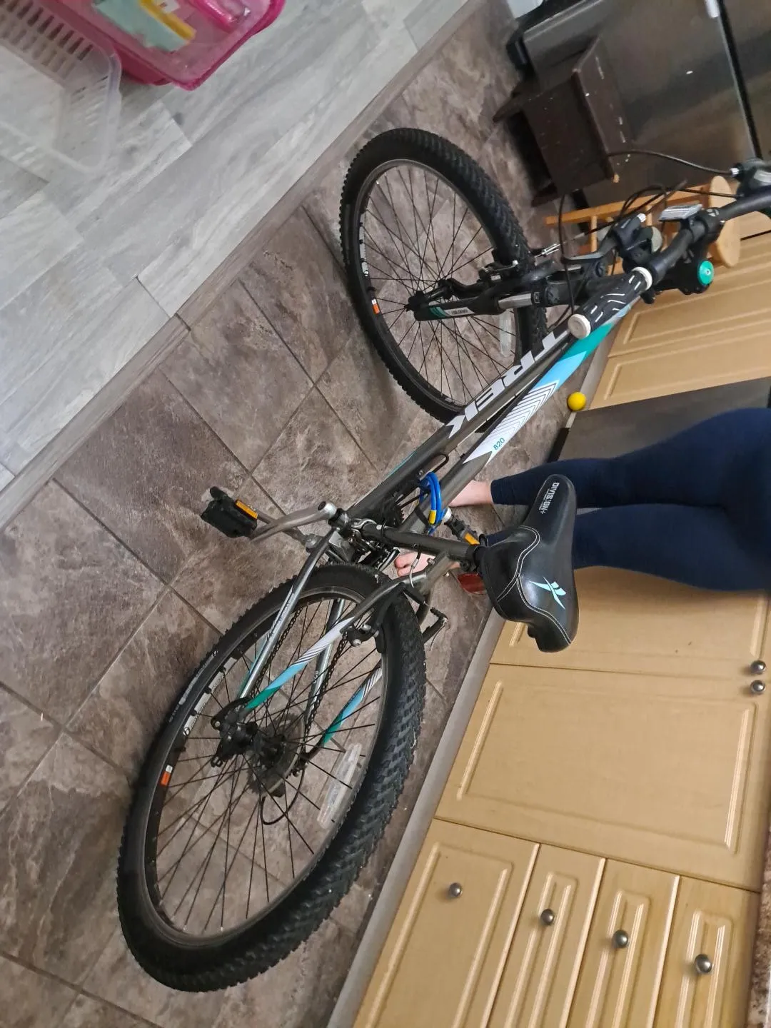 Grey and teal Trek 820 mountain bike with 27.5-inch wheels. Features a durable aluminum frame and suspension fork. Ready for your next adventure!