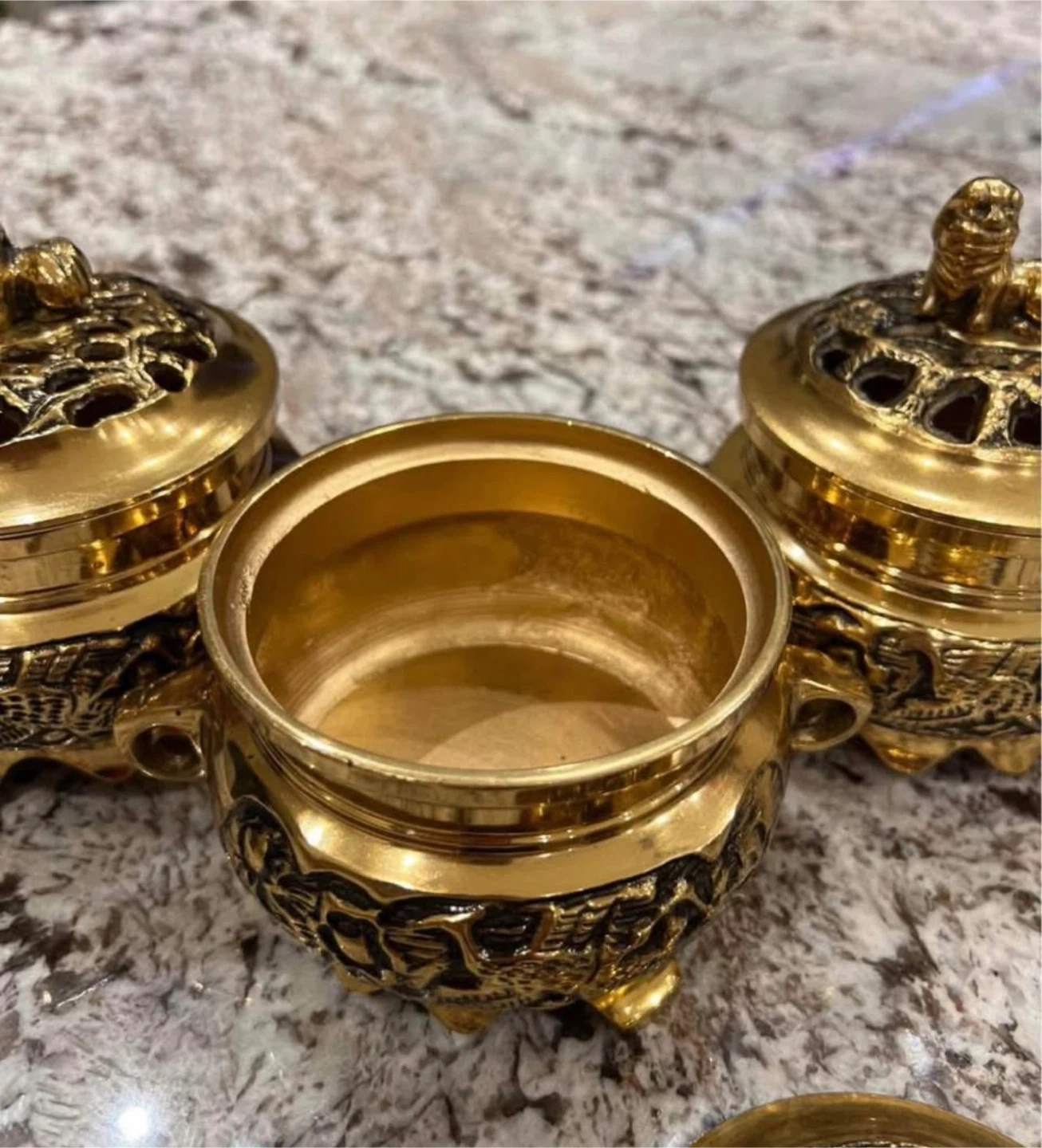 These are three decorative gold-coloured incense burners. They're crafted from metal with intricate embossed designs and lion finials. Perfect for holding incense in a living space or for decorative purposes!