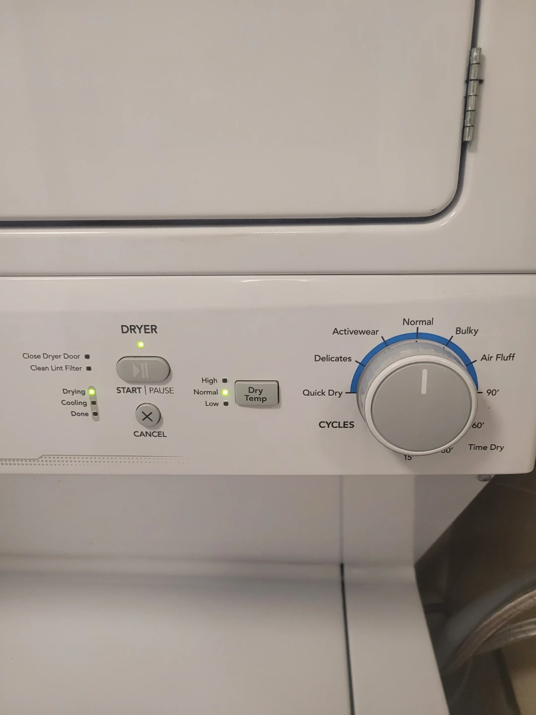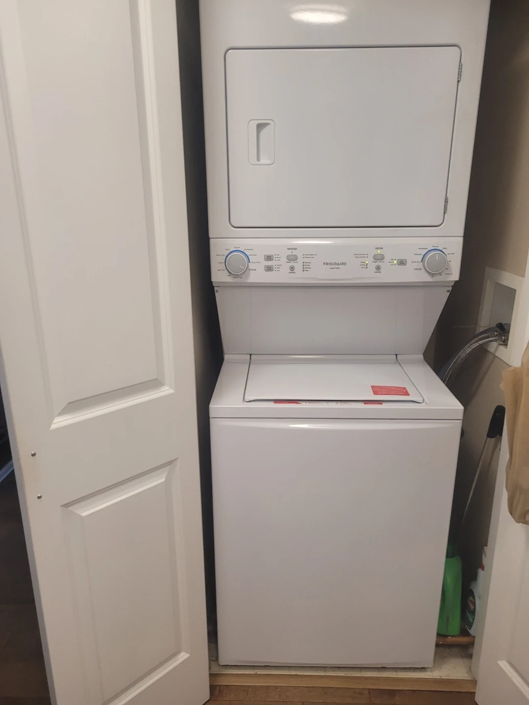 This Frigidaire stackable washer and dryer combo is in white. It offers multiple wash and dry cycles, including Normal, Delicates, Activewear, and Bulkier items. The dryer has options for different heat settings and cycle times. It's a space-saving solution for your laundry needs!Selling because we need front loading. PAID $1500+.PLEASE SEE ALL PICTURES for details