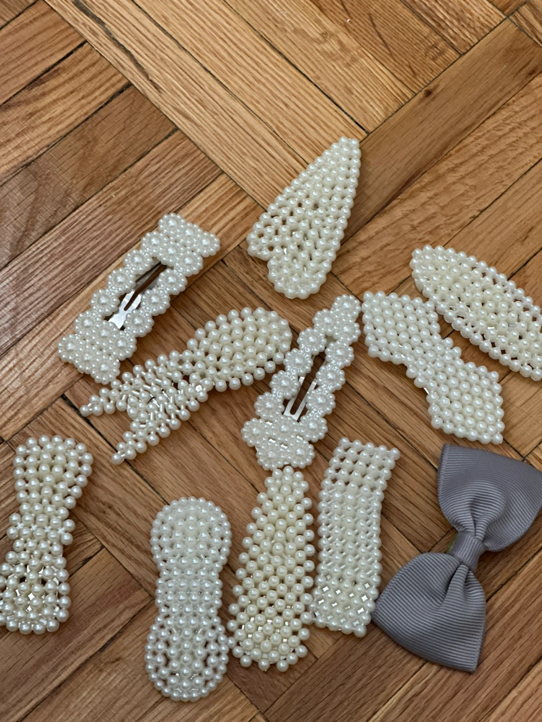 A cute collection of pearl-embellished hair clips and a grey bow! Perfect for adding a touch of elegance to any hairstyle.
