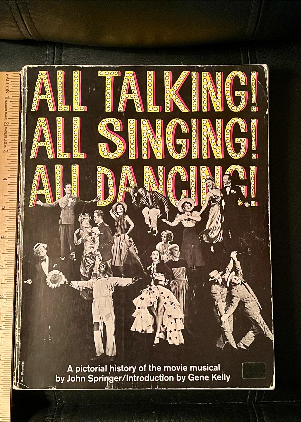 This is a pictorial history of the movie musical. It's written by John Springer with an introduction by Gene Kelly. The book is filled with photographs and details about classic movie musicals. 256 pages. Softcover in good condition with pen underlining on one page.