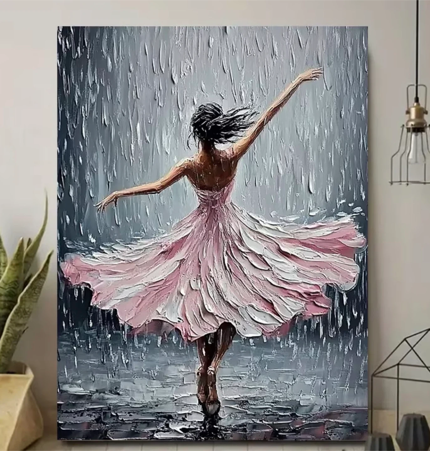 A textured painting of a ballet dancer in a flowing pink dress dancing in the rain. The artwork features impasto techniques for a rich, tactile feel. It's a striking piece that adds a touch of elegance and drama to any space.