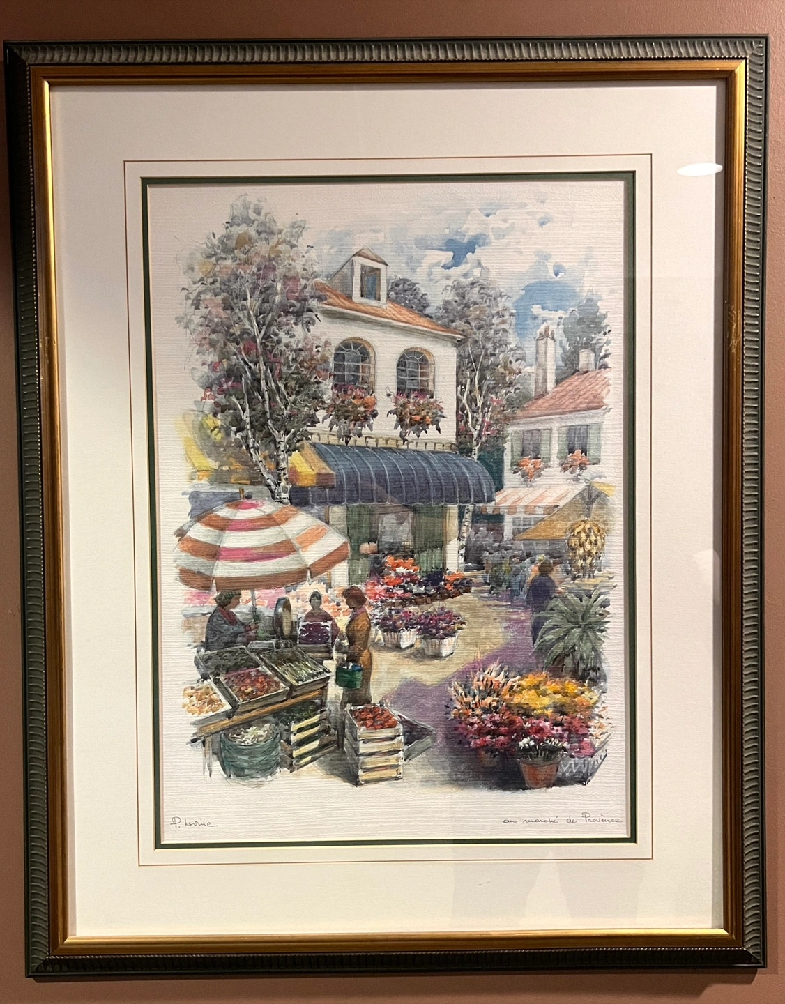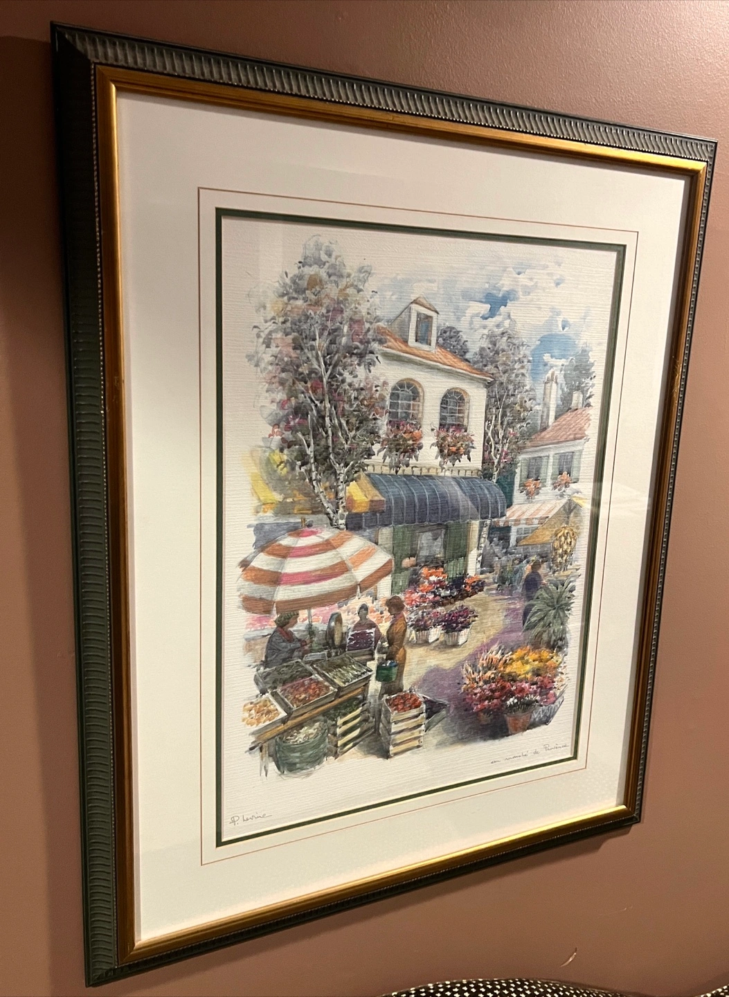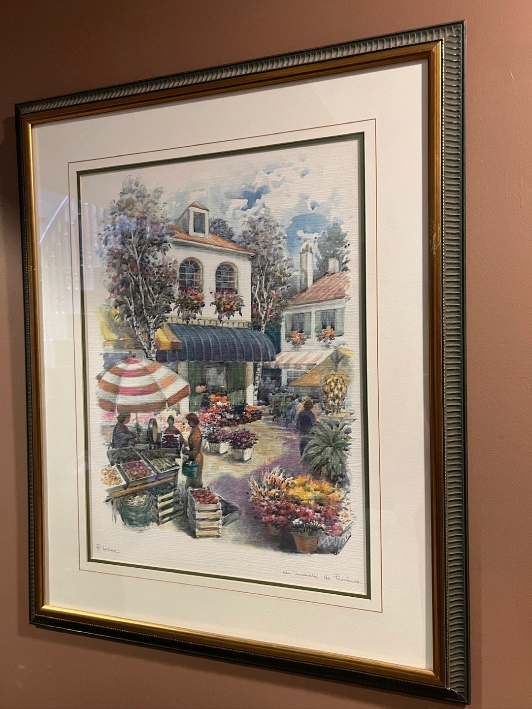 A lovely framed art print depicting a market scene in Provence. The print features a charming European town square filled with flowers and vendors. The frame is a decorative style, adding to the piece's overall appeal. It's ready to hang and would be a great addition to any room. Frame could use a little bit of touch-up.