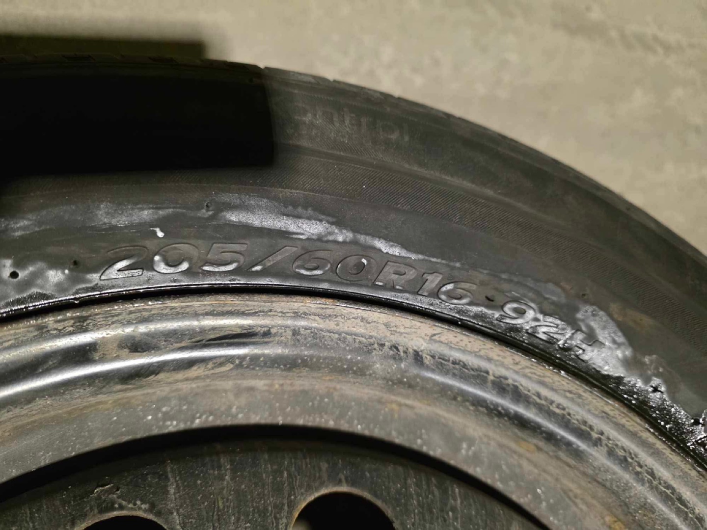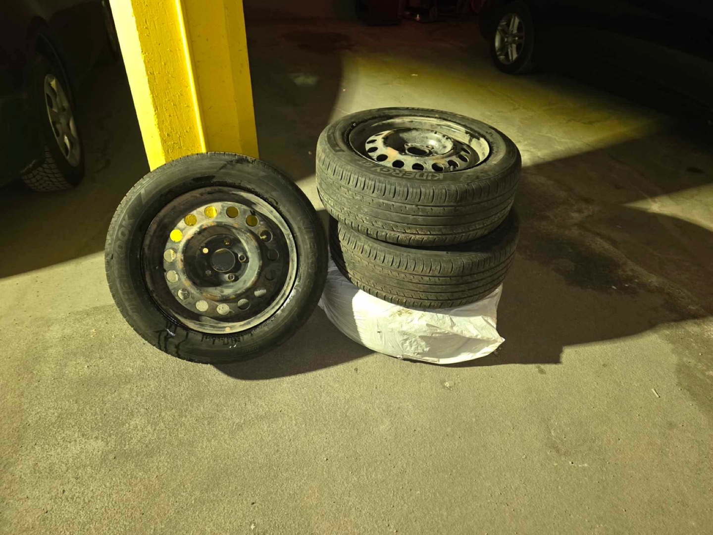 Set of 4 used Uniroyal tires mounted on steel rims. Size 205/60R16 92H. Good for a spare.