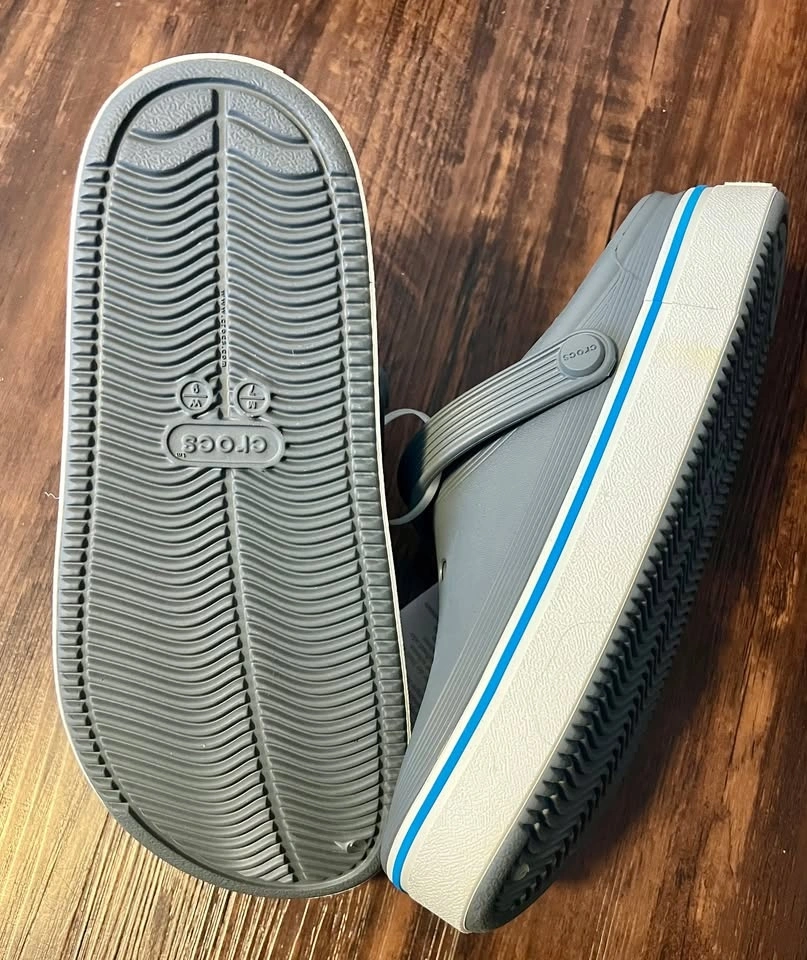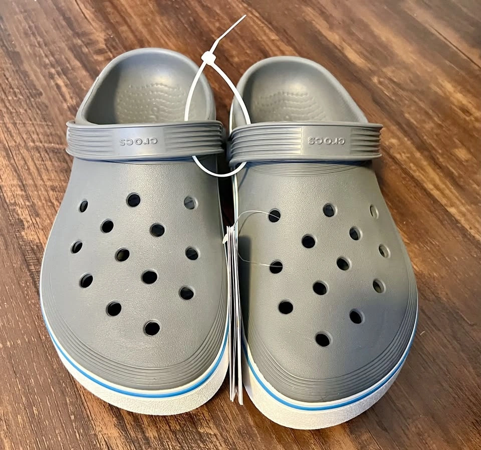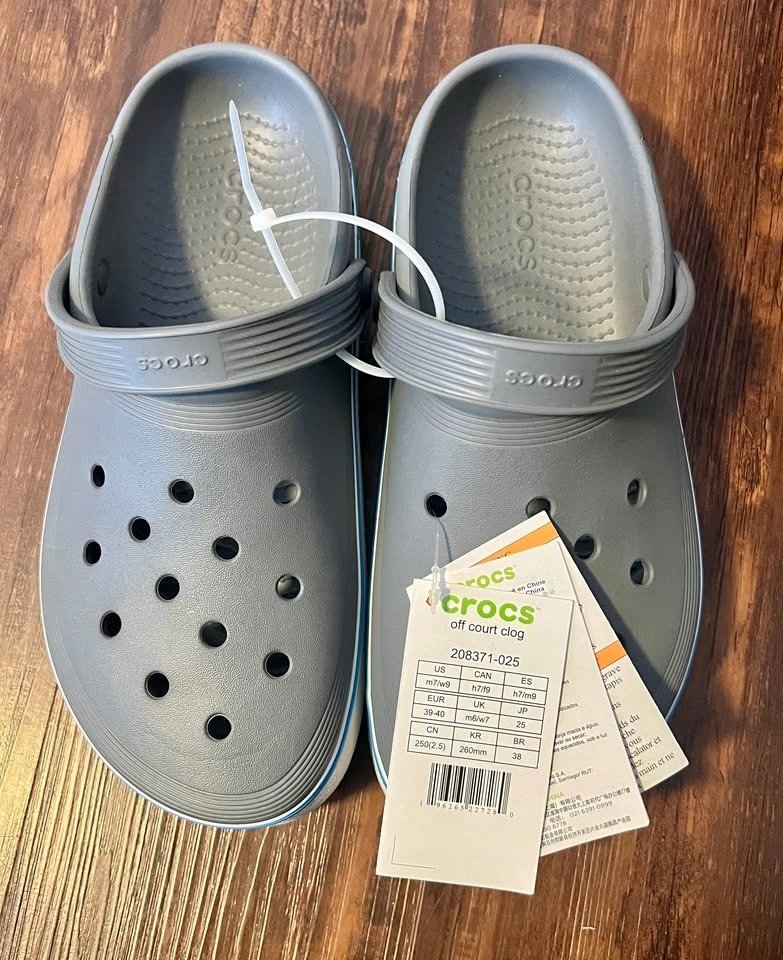 Brand new Crocs Off Court clogs in grey. Never worn, still attached with original tags. Size: Men’s 7 / Women’s 9 (M7/W9). Pickup in a public location.