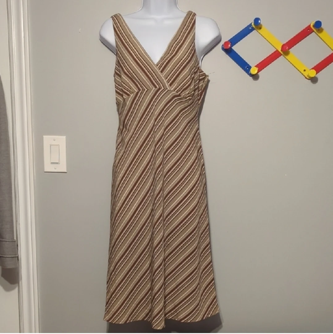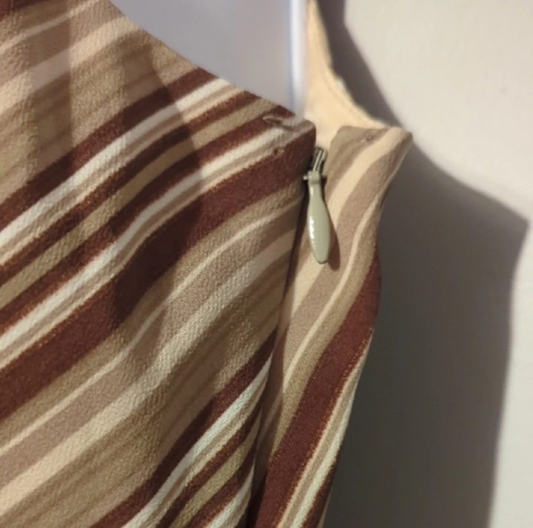 This sleeveless midi dress features a v-neckline and a flattering empire waist. It's made from a lightweight, striped fabric in shades of brown and beige. The dress has a side zipper closure. It's suitable for casual outings or can be dressed up for a slightly more formal occasion.