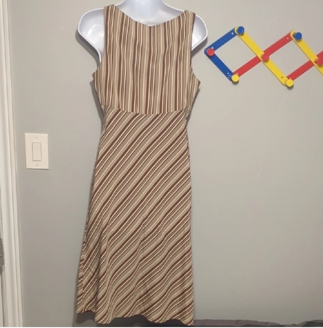 This sleeveless midi dress features a v-neckline and a flattering empire waist. It's made from a lightweight, striped fabric in shades of brown and beige. The dress has a side zipper closure. It's suitable for casual outings or can be dressed up for a slightly more formal occasion.