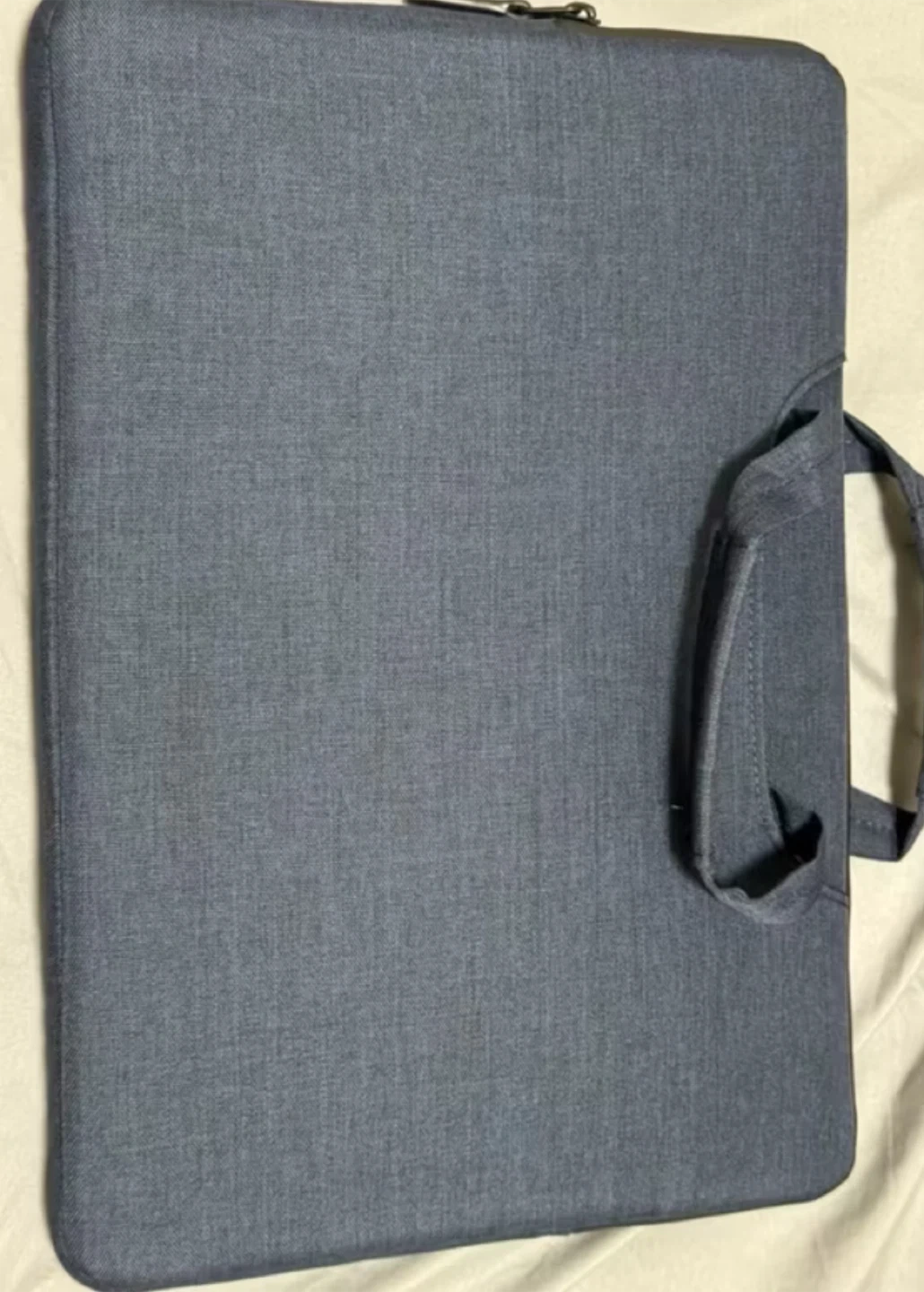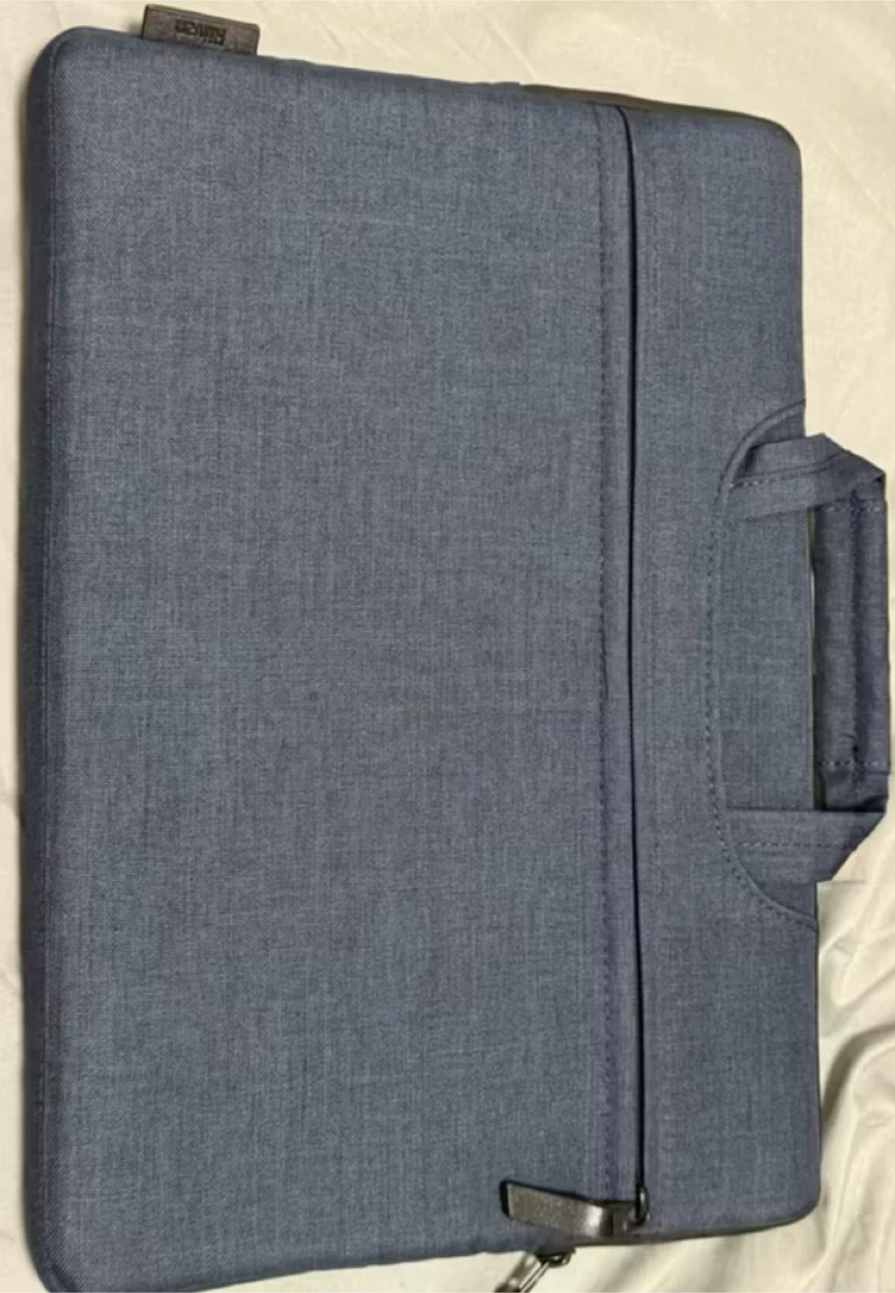 It's made of durable fabric material. The case has a comfortable handle for carrying. Perfect for protecting your laptop on the go!