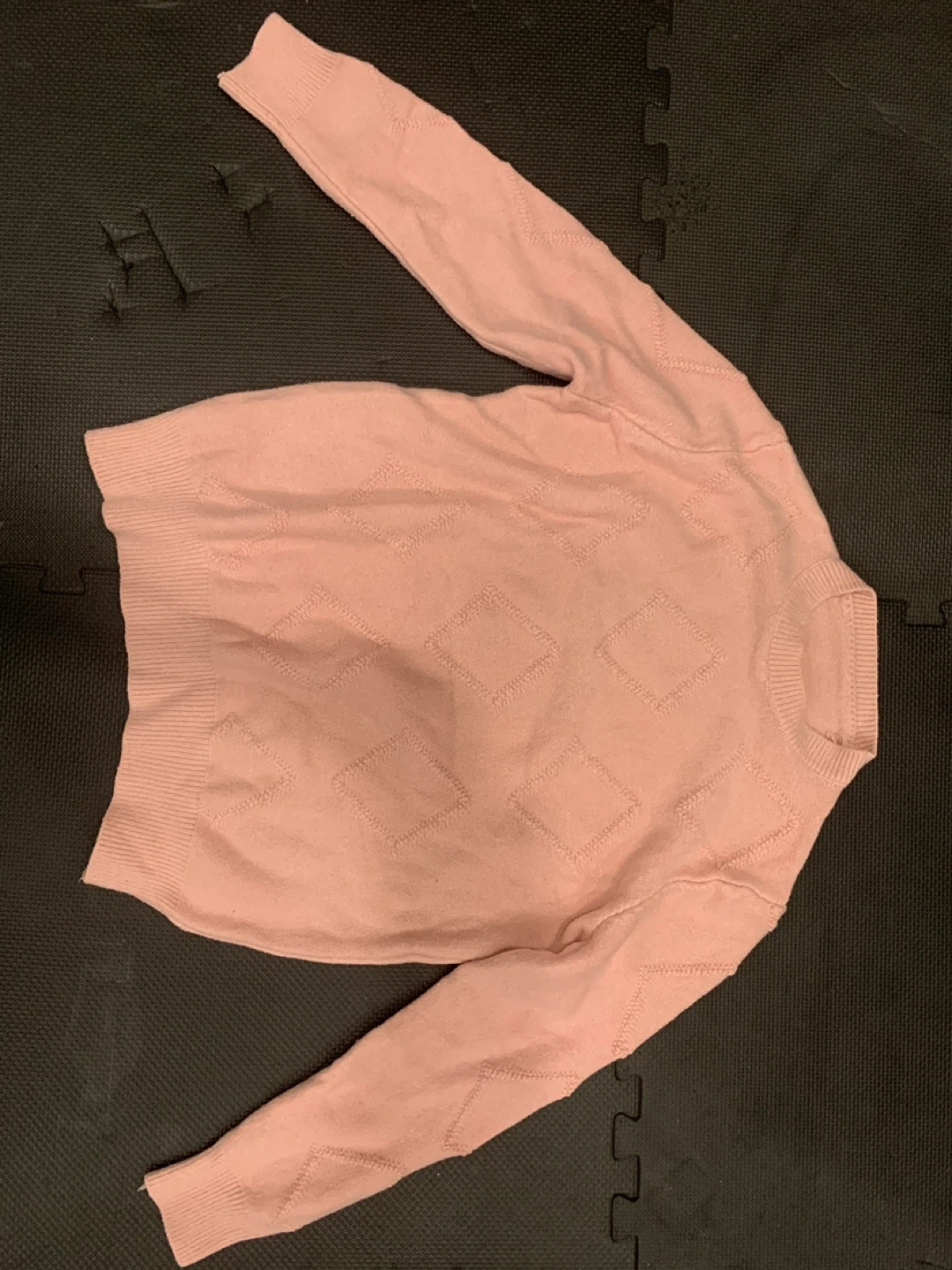This is a soft pink sweater with an all-over argyle knit pattern. It's a long-sleeved crew neck style. This sweater is perfect for adding a touch of classic style to your wardrobe!