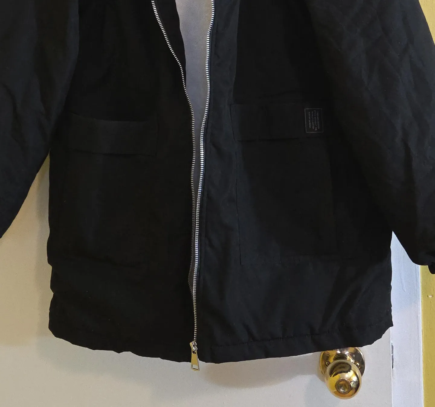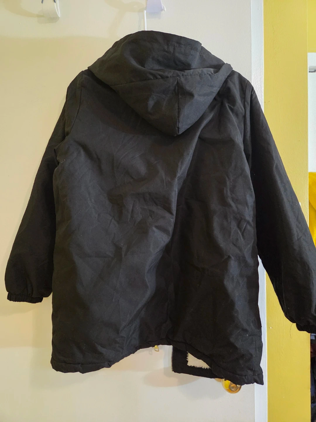 This black hooded jacket is lined with a soft, fuzzy material for extra warmth. It features a zipper closure and two front pockets. It's perfect for chilly days!