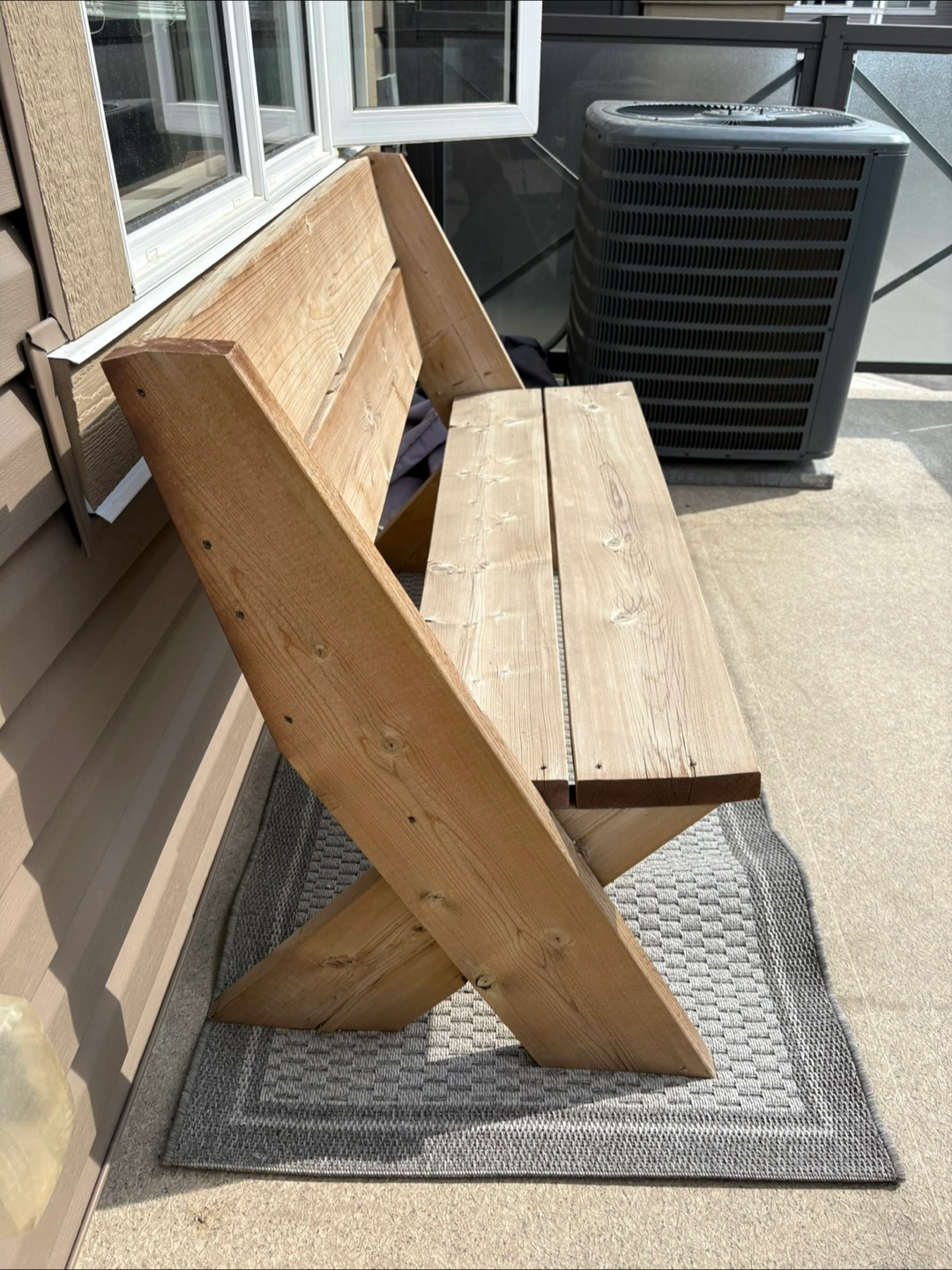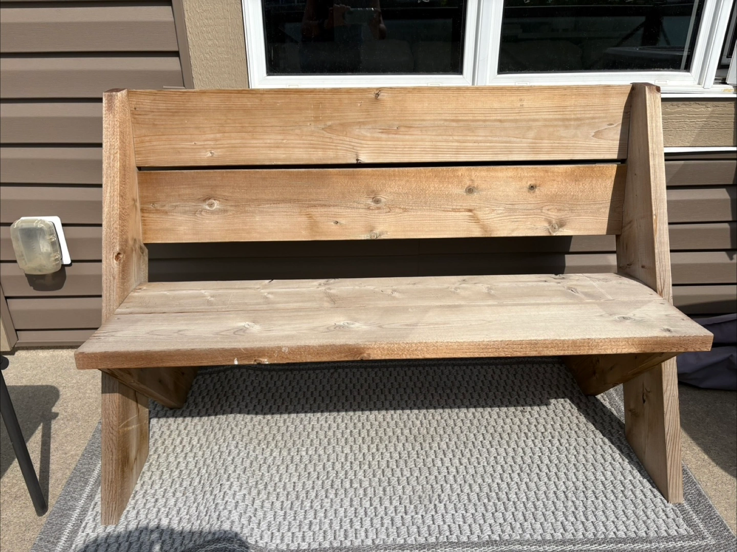 Beautiful wooden bench. Features a backrest. Constructed from wood. Perfect for enjoying a quiet moment outdoors.