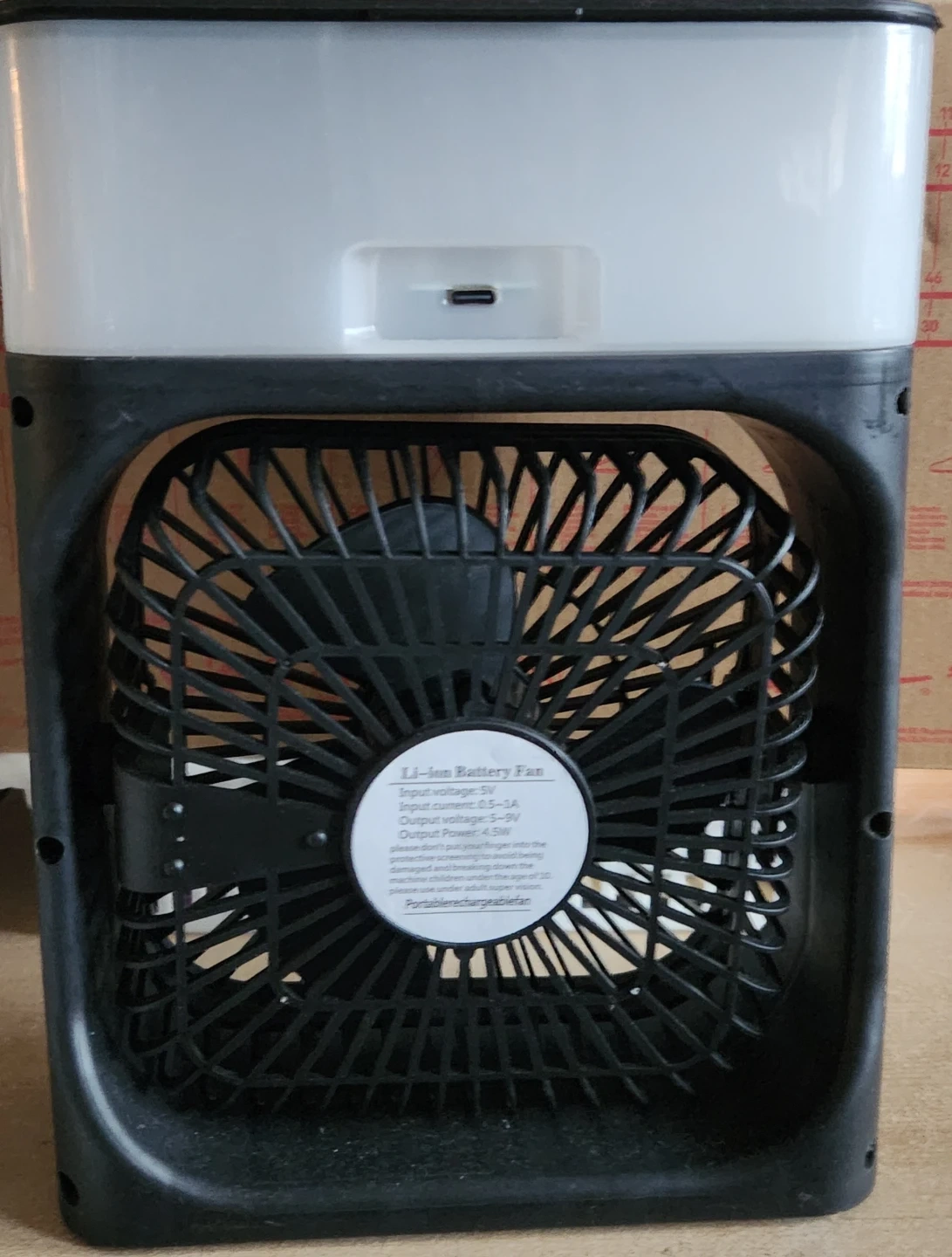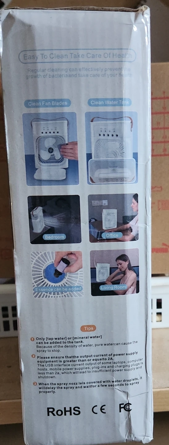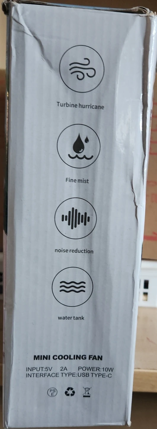 This mini cooling fan features turbine hurricane airflow and a fine mist function for comfort. It has a water tank and noise reduction for a quiet operation. Input: 5V, 2A; Power: 10W; Interface Type: USB Type-C.