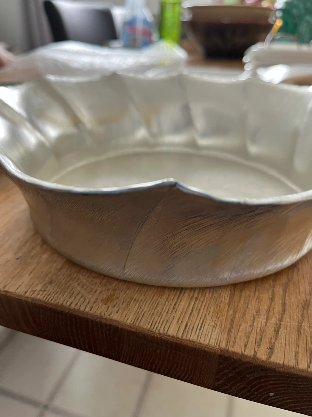 This is a lovely silver-tone bowl with a decorative, fluted edge. It has a brushed metal finish inside. It's suitable for serving or as a decorative piece on a table.