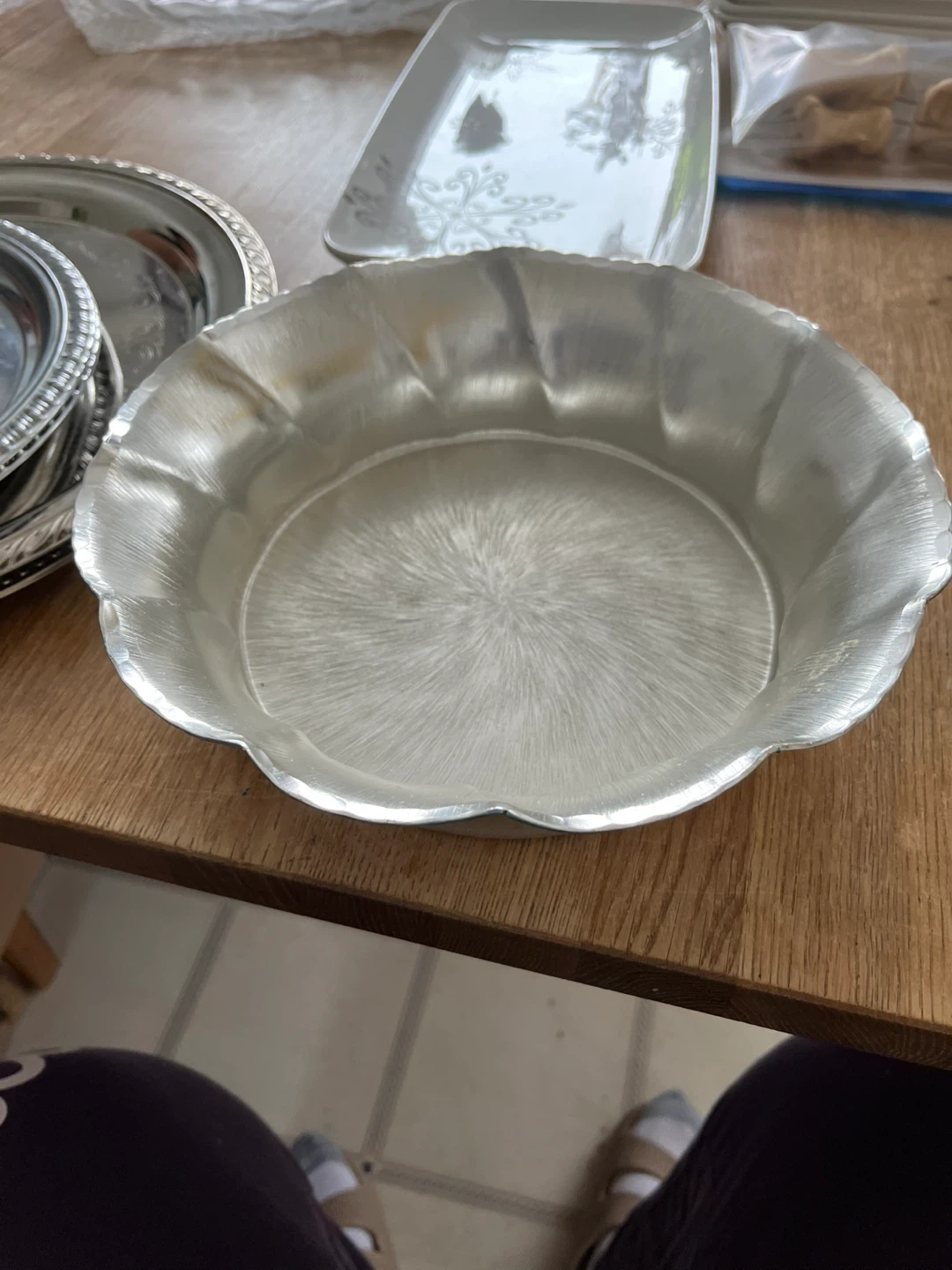 This is a lovely silver-tone bowl with a decorative, fluted edge. It has a brushed metal finish inside. It's suitable for serving or as a decorative piece on a table.