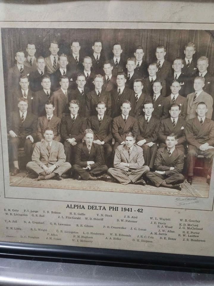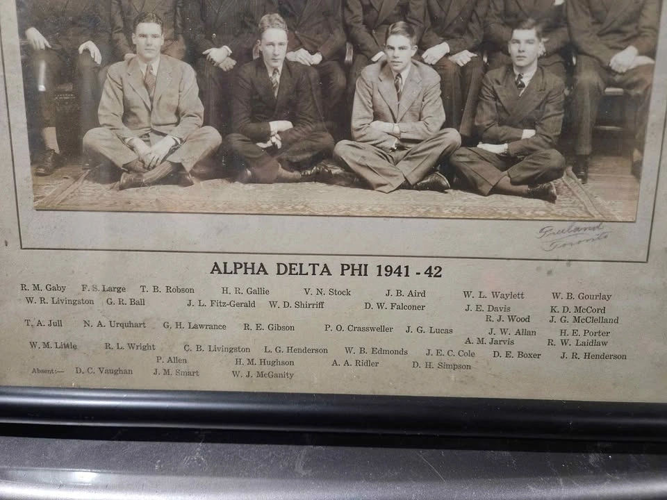 Vintage framed fraternity composite photograph titled “Alpha Delta Phi 1941–42.” This black-and-white composite portrait shows members of the Alpha Delta Phi fraternity chapter during the 1941–1942 academic year. The photograph includes the printed names of all members beneath the image. Photographed by Friedland Studios, Toronto, a studio known for producing university and fraternity composite photographs in the early 20th century. Because the names are printed, this piece may be of interest to collectors of Canadian university memorabilia, fraternity history, or families researching genealogy. Member Names Printed on Photo: R. M. Gaby, F. S. Large, T. B. Robson, H. R. Gallie, V. N. Stock, J. B. Aird, W. L. Waylett, W. B. Gourlay, W. R. Livingston, G. R. Ball, J. L. Fitz-Gerald, W. D. Shirriff, D. W. Falconer, J. E. Davis, K. D. McCord, J. G. McClelland, T. A. Jull, N. A. Urquhart, G. H. Lawrence, R. E. Gibson, P. O. Crassweller, J. G. Lucas, R. J. Wood, H. E. Porter, W. M. Little, R. L. Wright, C. B. Livingston, L. G. Henderson, W. B. Edmonds, J. E. C. Cole, J. W. Allan, A. M. Jarvis, P. Allen, H. M. Hughson, A. A. Ridler, D. H. Simpson, D. E. Boxer, R. W. Laidlaw, J. R. Henderson. Absent: D. C. Vaughan, J. M. Smart, W. J. McGanity. Original vintage black-and-white photograph, framed under glass. Studio credit: Friedland Studios – Toronto. Titled Alpha Delta Phi 1941–42. Shows typical wear consistent with age. The rear paper backing has some tearing and wear, but the photograph and frame display well. Please review all photos carefully for condition. A great piece of Canadian university history or fraternity memorabilia from the World War II era.