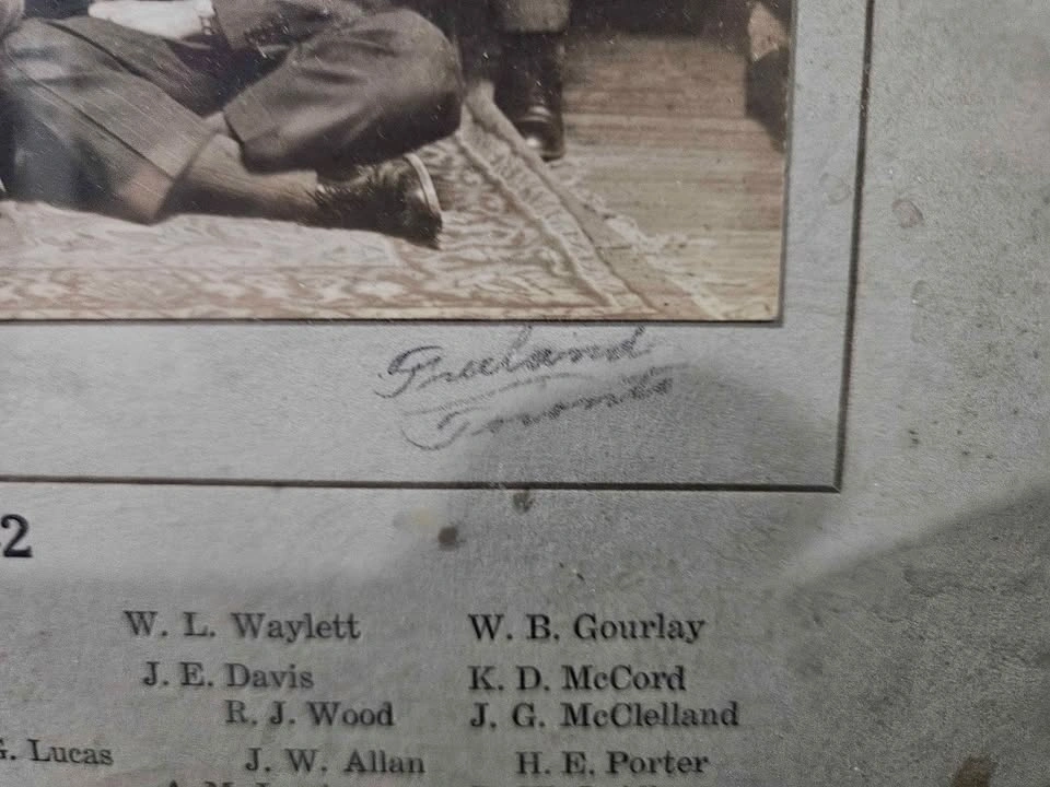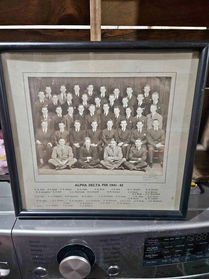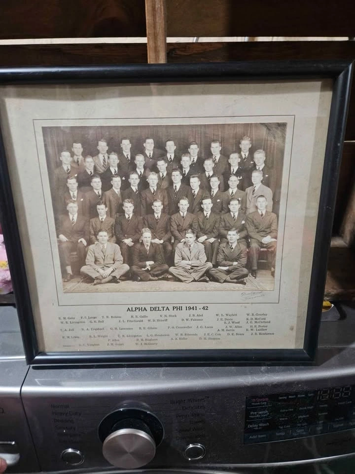 Vintage framed fraternity composite photograph titled “Alpha Delta Phi 1941–42.” This black-and-white composite portrait shows members of the Alpha Delta Phi fraternity chapter during the 1941–1942 academic year. The photograph includes the printed names of all members beneath the image. Photographed by Friedland Studios, Toronto, a studio known for producing university and fraternity composite photographs in the early 20th century. Because the names are printed, this piece may be of interest to collectors of Canadian university memorabilia, fraternity history, or families researching genealogy. Member Names Printed on Photo: R. M. Gaby, F. S. Large, T. B. Robson, H. R. Gallie, V. N. Stock, J. B. Aird, W. L. Waylett, W. B. Gourlay, W. R. Livingston, G. R. Ball, J. L. Fitz-Gerald, W. D. Shirriff, D. W. Falconer, J. E. Davis, K. D. McCord, J. G. McClelland, T. A. Jull, N. A. Urquhart, G. H. Lawrence, R. E. Gibson, P. O. Crassweller, J. G. Lucas, R. J. Wood, H. E. Porter, W. M. Little, R. L. Wright, C. B. Livingston, L. G. Henderson, W. B. Edmonds, J. E. C. Cole, J. W. Allan, A. M. Jarvis, P. Allen, H. M. Hughson, A. A. Ridler, D. H. Simpson, D. E. Boxer, R. W. Laidlaw, J. R. Henderson. Absent: D. C. Vaughan, J. M. Smart, W. J. McGanity. Original vintage black-and-white photograph, framed under glass. Studio credit: Friedland Studios – Toronto. Titled Alpha Delta Phi 1941–42. Shows typical wear consistent with age. The rear paper backing has some tearing and wear, but the photograph and frame display well. Please review all photos carefully for condition. A great piece of Canadian university history or fraternity memorabilia from the World War II era.