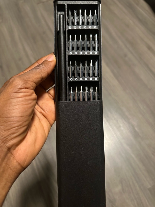 This portable screwdriver set includes 24 bits. It's a compact and versatile tool, perfect for various repair and maintenance tasks. All the bits are present and accounted for. Never used. Pickup. No holds