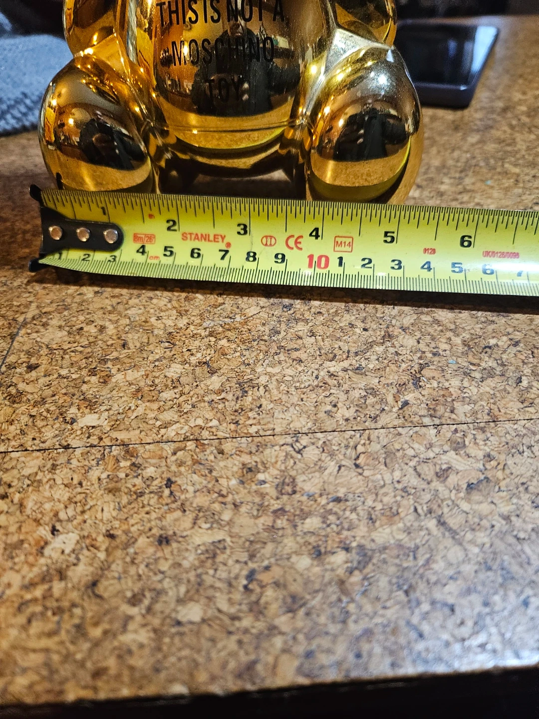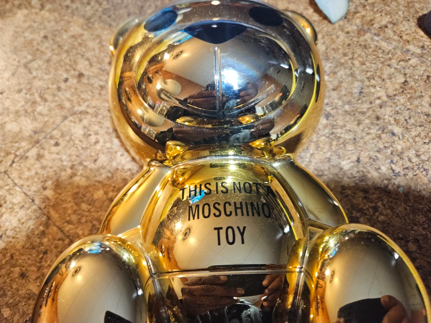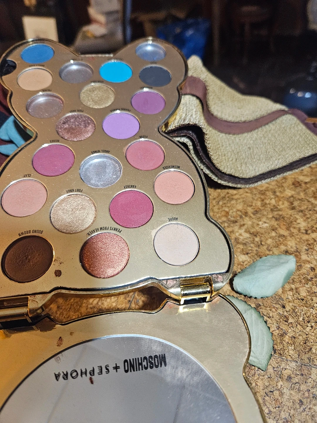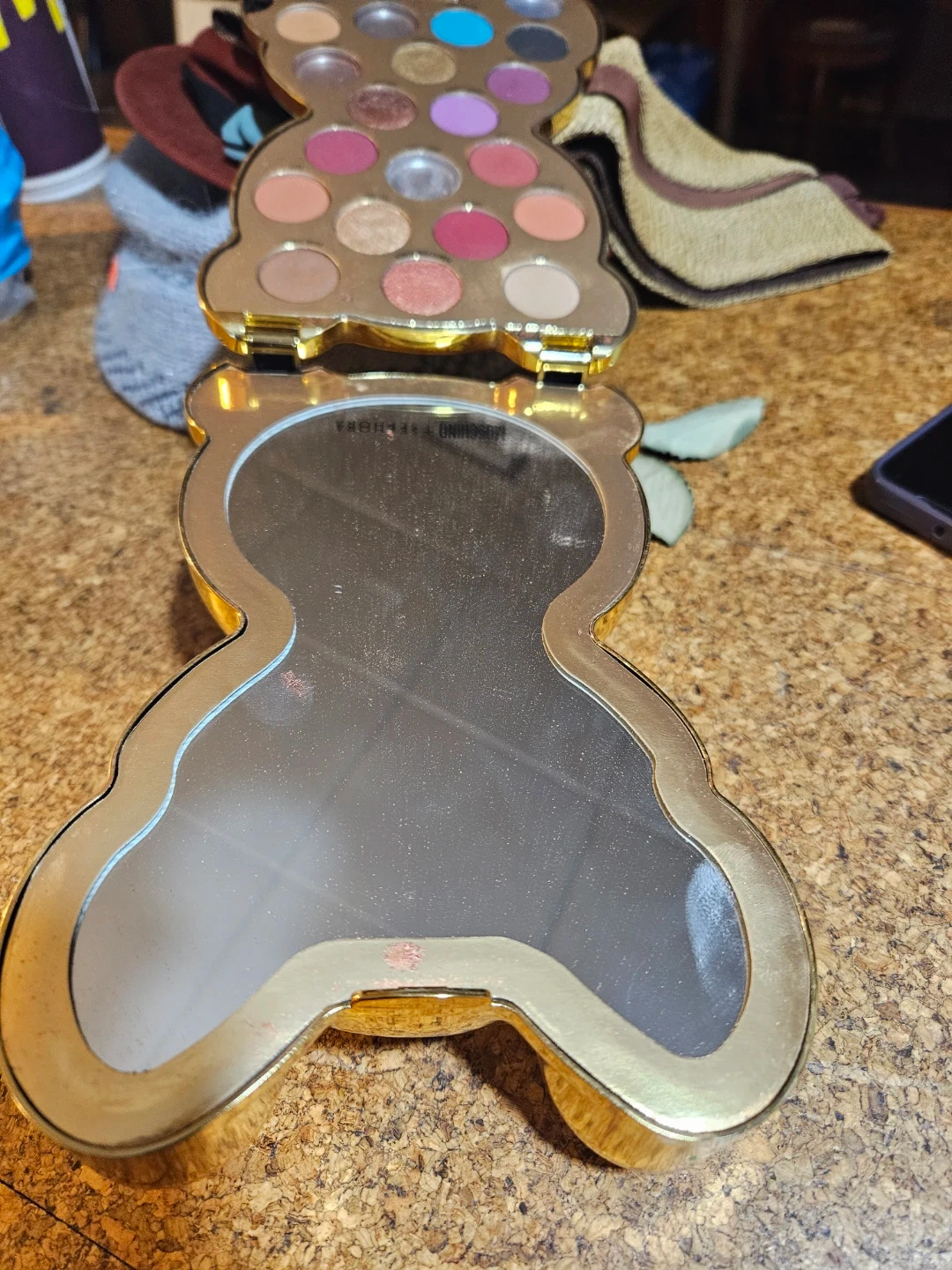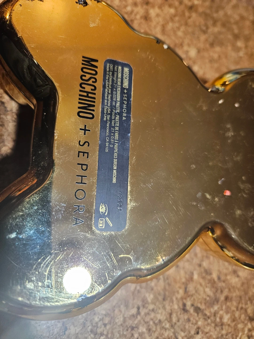 This is the Moschino + Sephora eyeshadow palette shaped like a bear. It's a gold-toned compact with multiple eyeshadow shades. The compact includes a mirror inside.