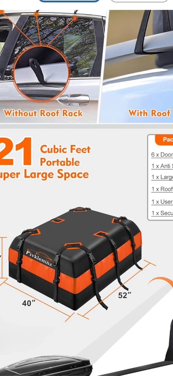 This Fivklemnz car top carrier provides 21 cubic feet of portable, super large space. It measures 40" x 52". It can be installed with or without a roof rack. Includes 6 x door straps, 1 x anti-slip mat, 1 x large straps, 1 x roof straps, 1 x user manual, and 1 x security strap.