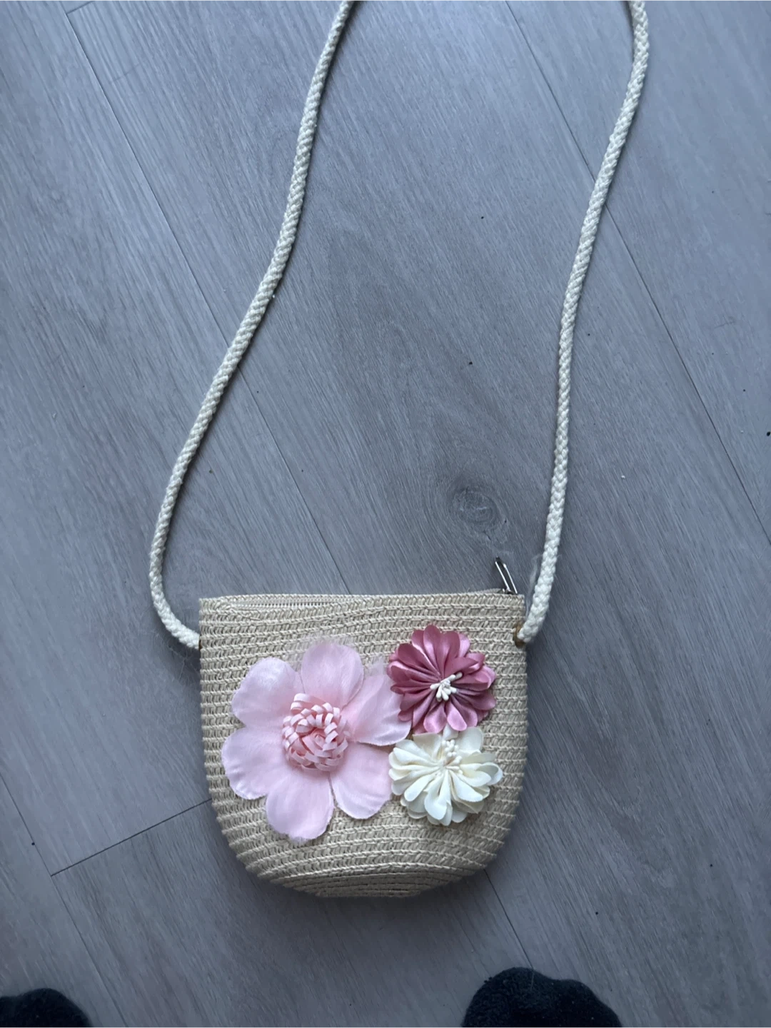 This cute crossbody bag features a woven straw construction and is adorned with pink and white floral appliques. It has a braided rope strap for comfortable wear. Perfect for a little one's essentials!