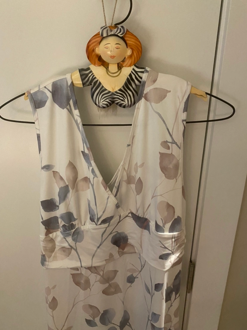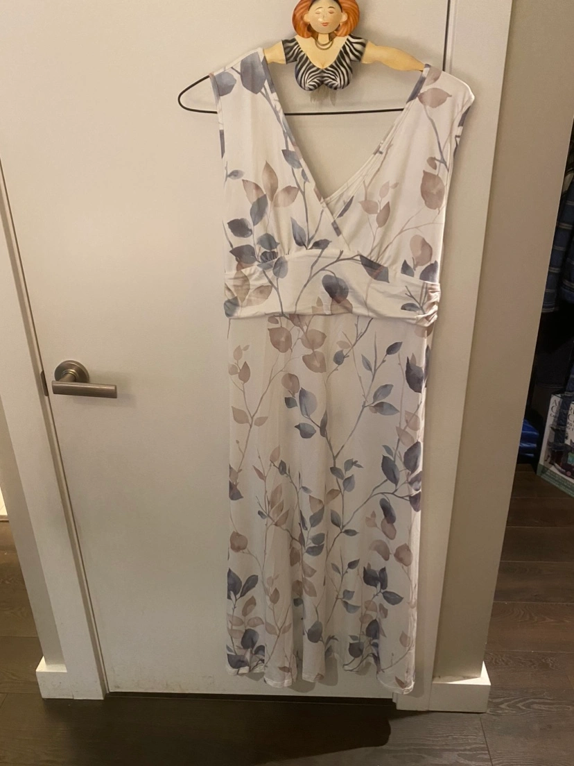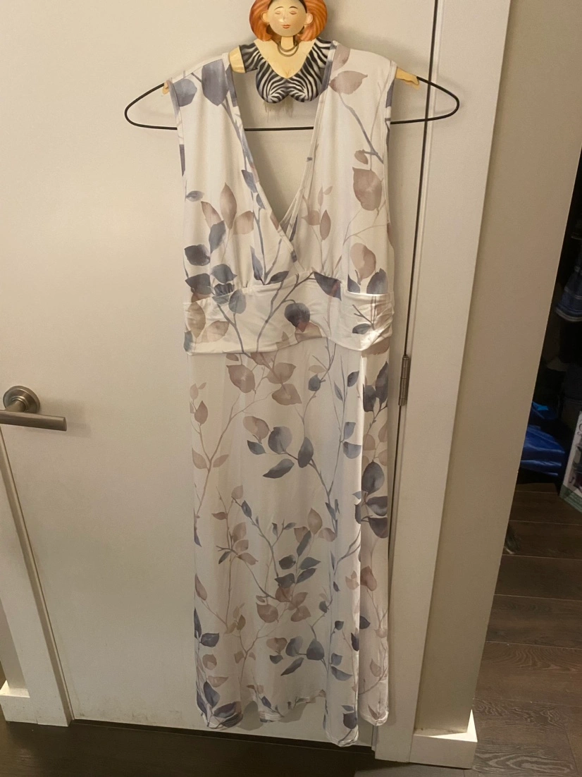 White sleeveless maxi dress with a V neckline and a floral pattern. Lots of stretch ( pretty and comfortable) π