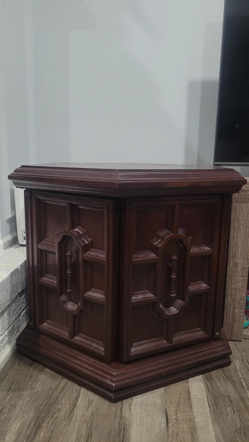 Solid wood corner cabinet, used but still sturdy and functional. Classic carved design with storage space inside. Perfect for a pooja mandir, corner storage, or decorative cabinet.