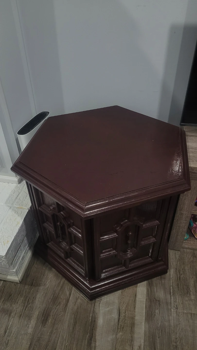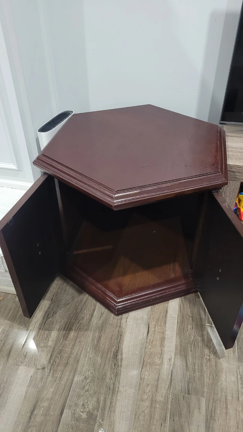 Solid wood corner cabinet, used but still sturdy and functional. Classic carved design with storage space inside. Perfect for a pooja mandir, corner storage, or decorative cabinet.