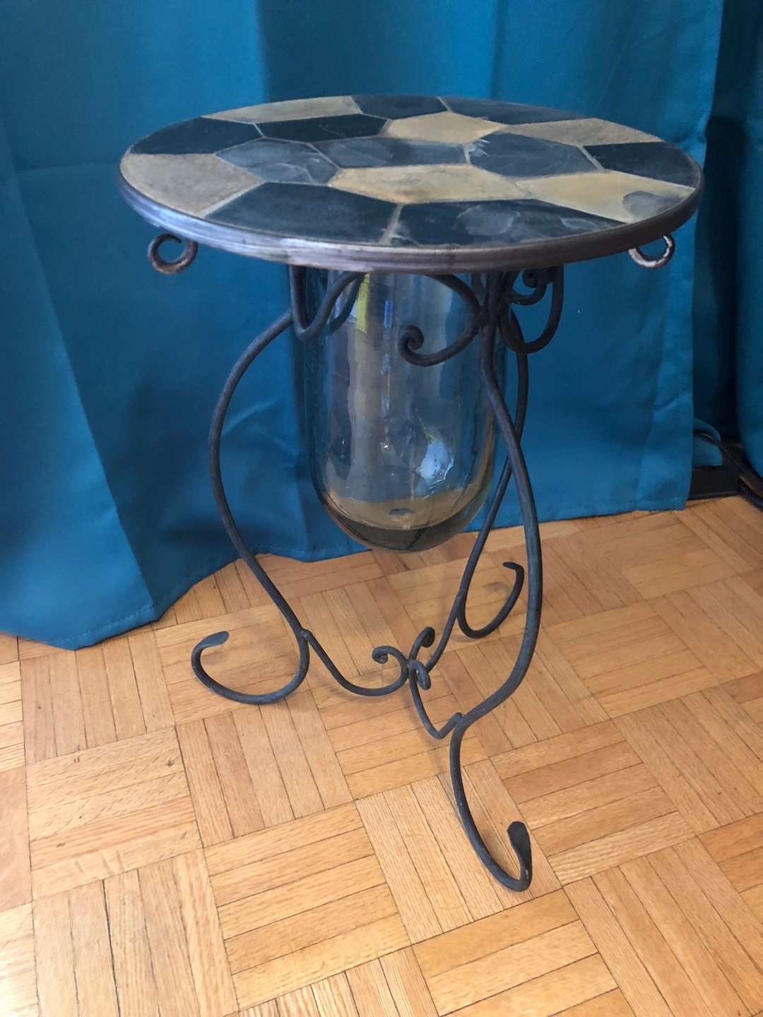 Ornate wrought iron stand. Features a round slate mosaic table top and a large glass vase. Perfect as a side table or unique decor piece.