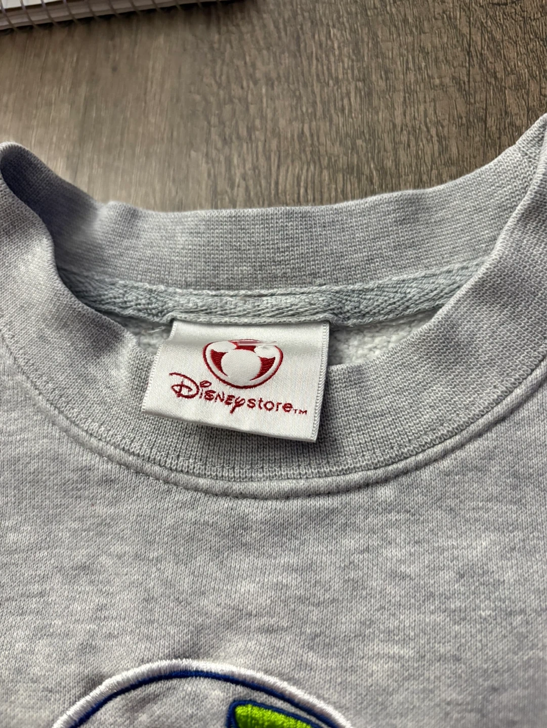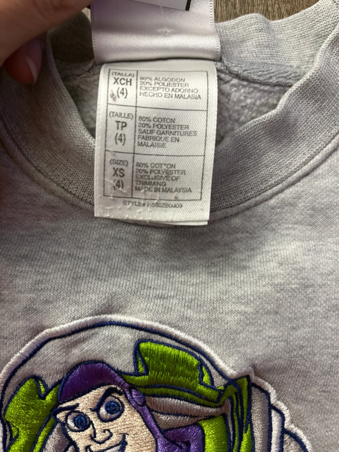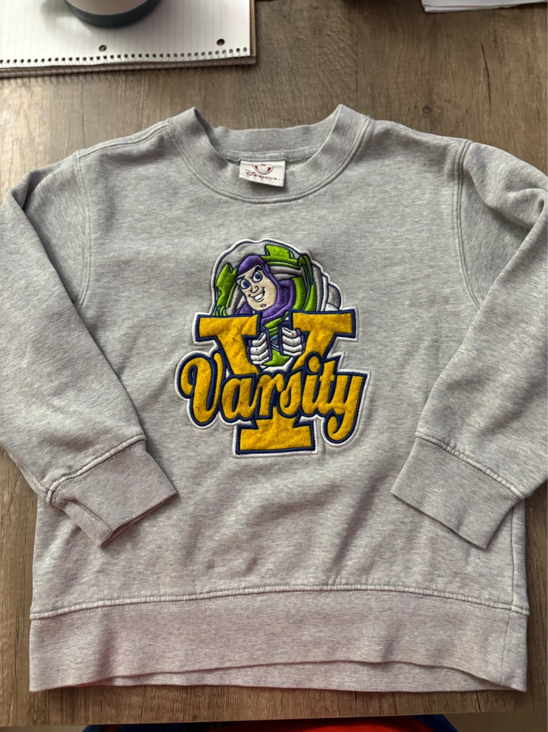 This is a light grey sweatshirt from the Disney Store featuring Buzz Lightyear and the word 'Varsity'. It's made of 80% cotton and 20% polyester. The size is listed as XS.