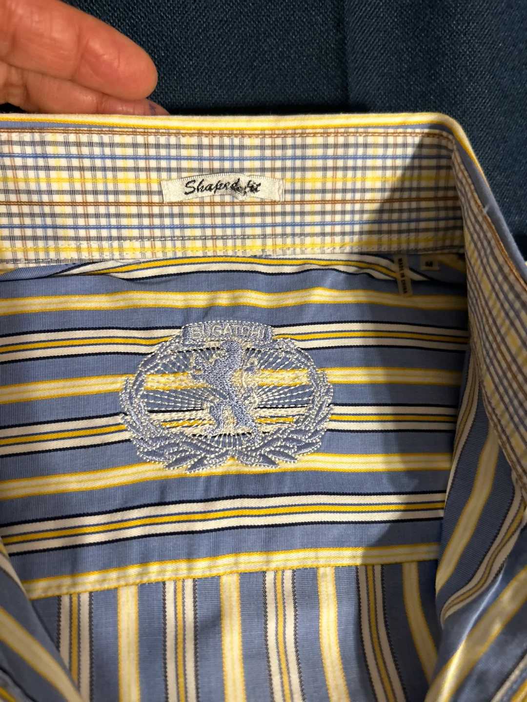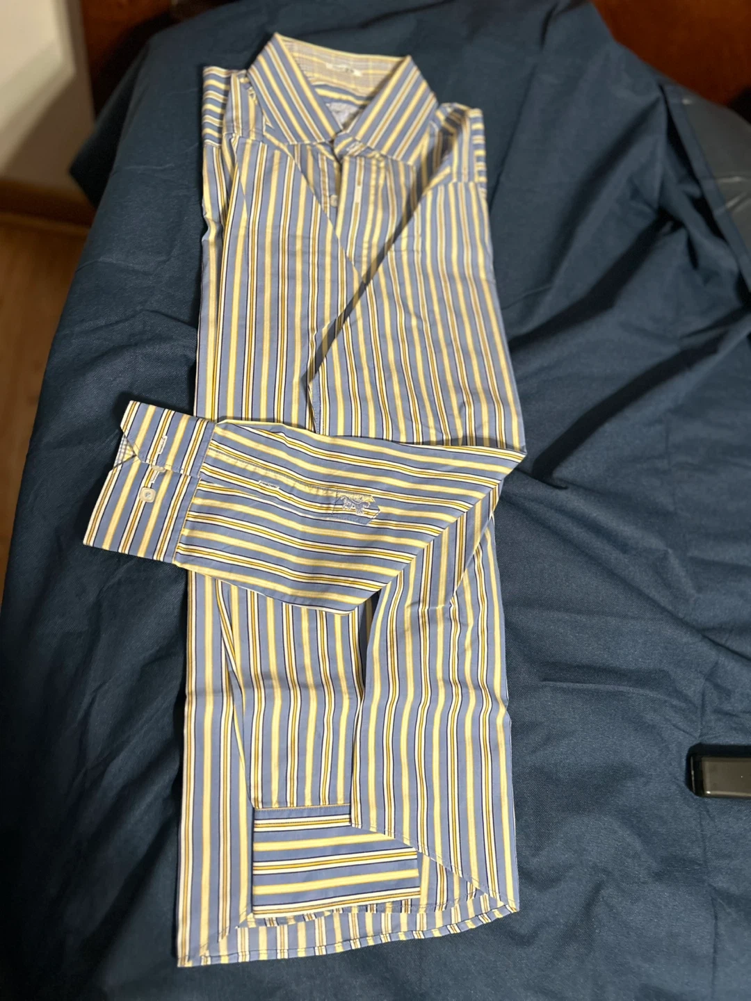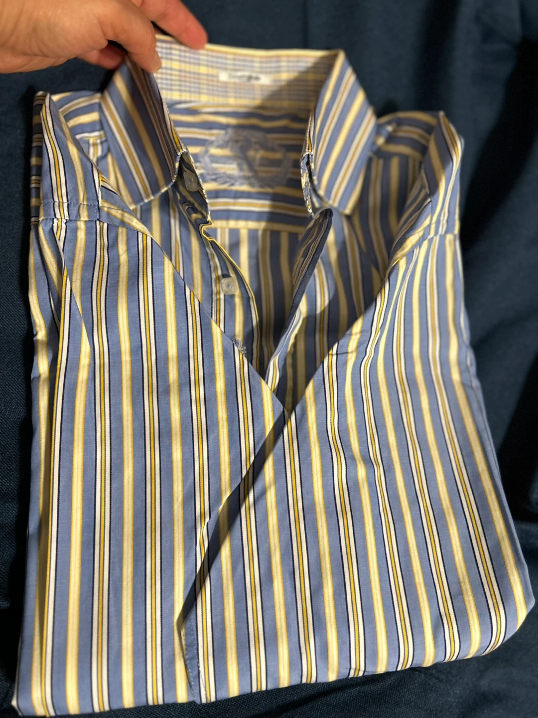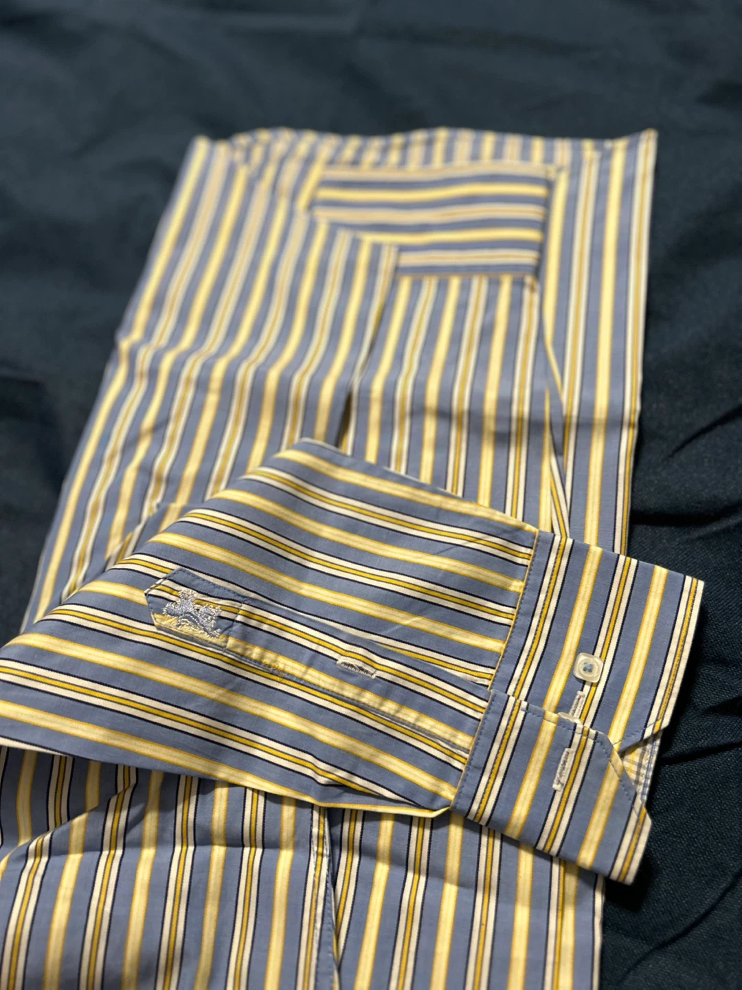 Selling a Bugatchi dress shirt with a blue and yellow striped pattern It's in great condition and ready for a new owner Perfect for adding a touch of style to your wardrobe