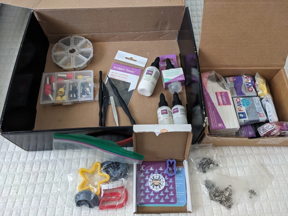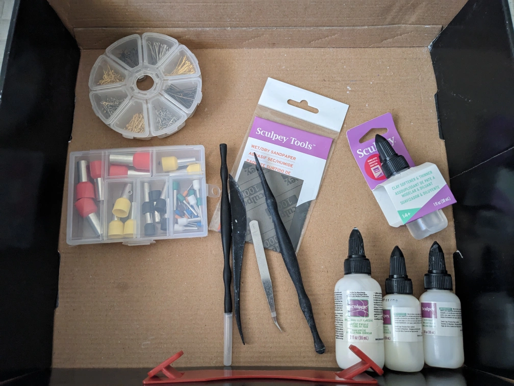 - Various crafting tools like tweezers, sandpaper, and clay softener