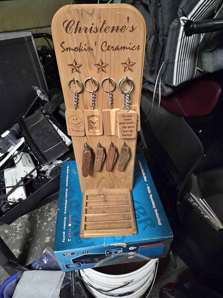 Selling a unique custom wooden cigar accessory display stand. It's engraved with “Christene’s Smokin’ Ceramics” and includes pocket knives and keychains, as shown. There's a built-in storage tray at the bottom. Great for cigar smokers, man caves, or as a gift idea. In good used condition with minor wear from storage. Pickup near McLaughlin and Bovaird.